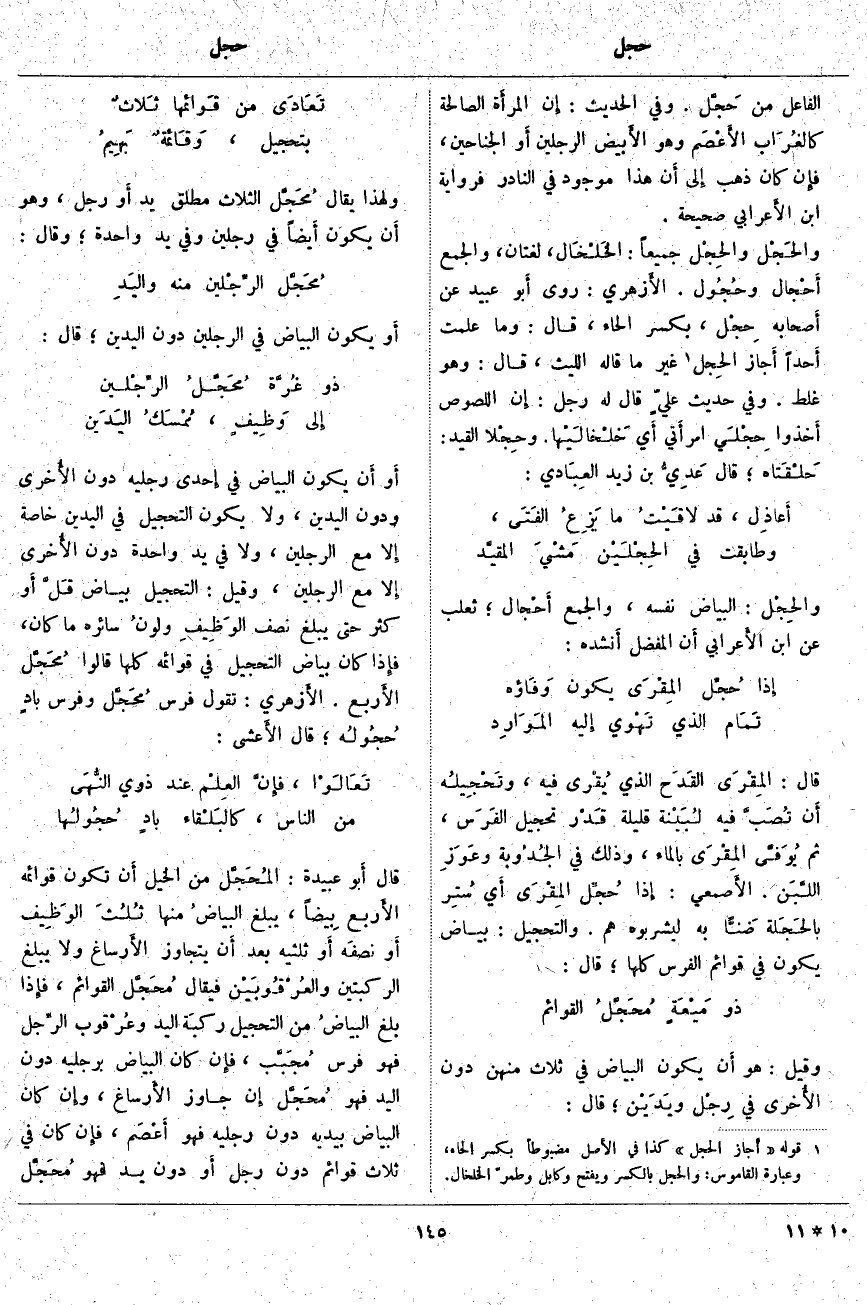 وَهُوَ الأَبيض الرِّجْلَيْنِ أَو الْجَنَاحَيْنِ، فإِن كَانَ ذَهَبَ إِلى أَن هَذَا مَوْجُودٌ فِي النَّادِرِ فَرِوَايَةُ ابْنِ الأَعرابي صَحِيحَةٌ. والحَجْل والحِجْل جَمِيعًا: الخَلْخَال، لُغَتَانِ، وَالْجَمْعُ أَحْجال وحُجُول. الأَزهري: رَوَى أَبو عُبَيْدٍ عَنْ أَصحابه حِجْل، بِكَسْرِ الْحَاءِ، قَالَ: وَمَا عَلِمْتُ أَحداً أَجاز الحِجل «1» غَيْرَ مَا قَالَهُ اللَّيْثُ، قَالَ: وَهُوَ غَلَطٌ. وَفِي حَدِيثِ
