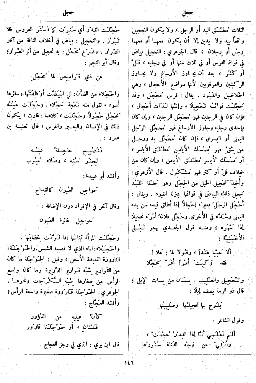 والحَجْلاء مِنَ الضأْن: الَّتِي ابْيَضَّت أَوْظِفَتُها وَسَائِرُهَا أَسود، تَقُولُ مِنْهُ نَعْجة حَجْلاء. وحَجَلَت عَيْنُه تَحْجُلُ حُجُولًا وحَجَّلَت، كِلَاهُمَا: غَارَتْ، يَكُونُ ذَلِكَ فِي الإِنسان وَالْبَعِيرِ وَالْفَرَسِ، قَالَ ثَعْلَبَةُ بْنُ عَمْرٍو: