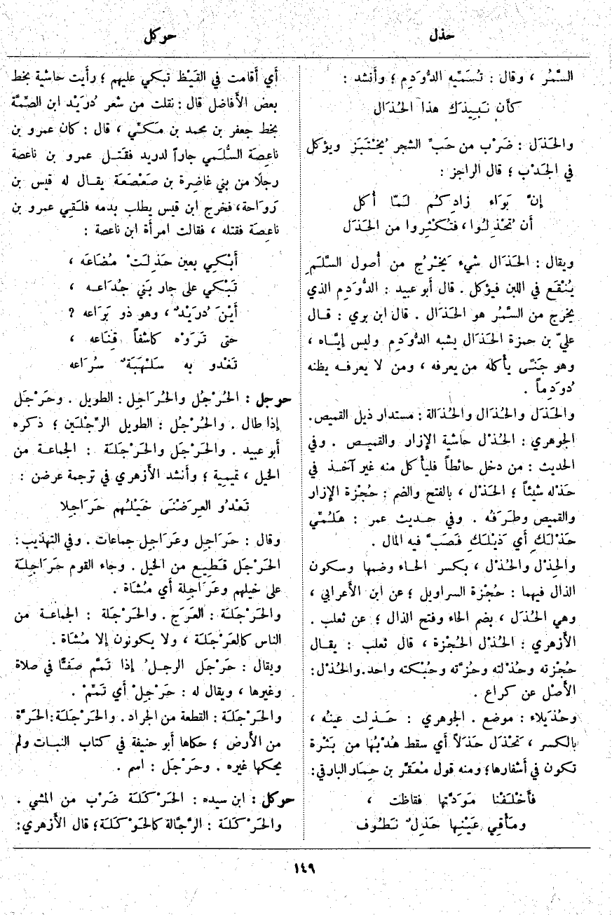 حرجل: الحُرْجُل والحُرَاجِل: الطَّوِيلُ. وحَرْجَل إِذا طَالَ. والحُرْجُل: الطَّوِيلُ الرِّجْلَين؛ ذَكَرَهُ أَبو عُبَيْدٍ. والحَرْجَل والحَرْجَلَة: الْجَمَاعَةُ مِنَ الْخَيْلِ، تميمِية؛ وأَنشد الأَزهري فِي تَرْجَمَةِ عرضن: