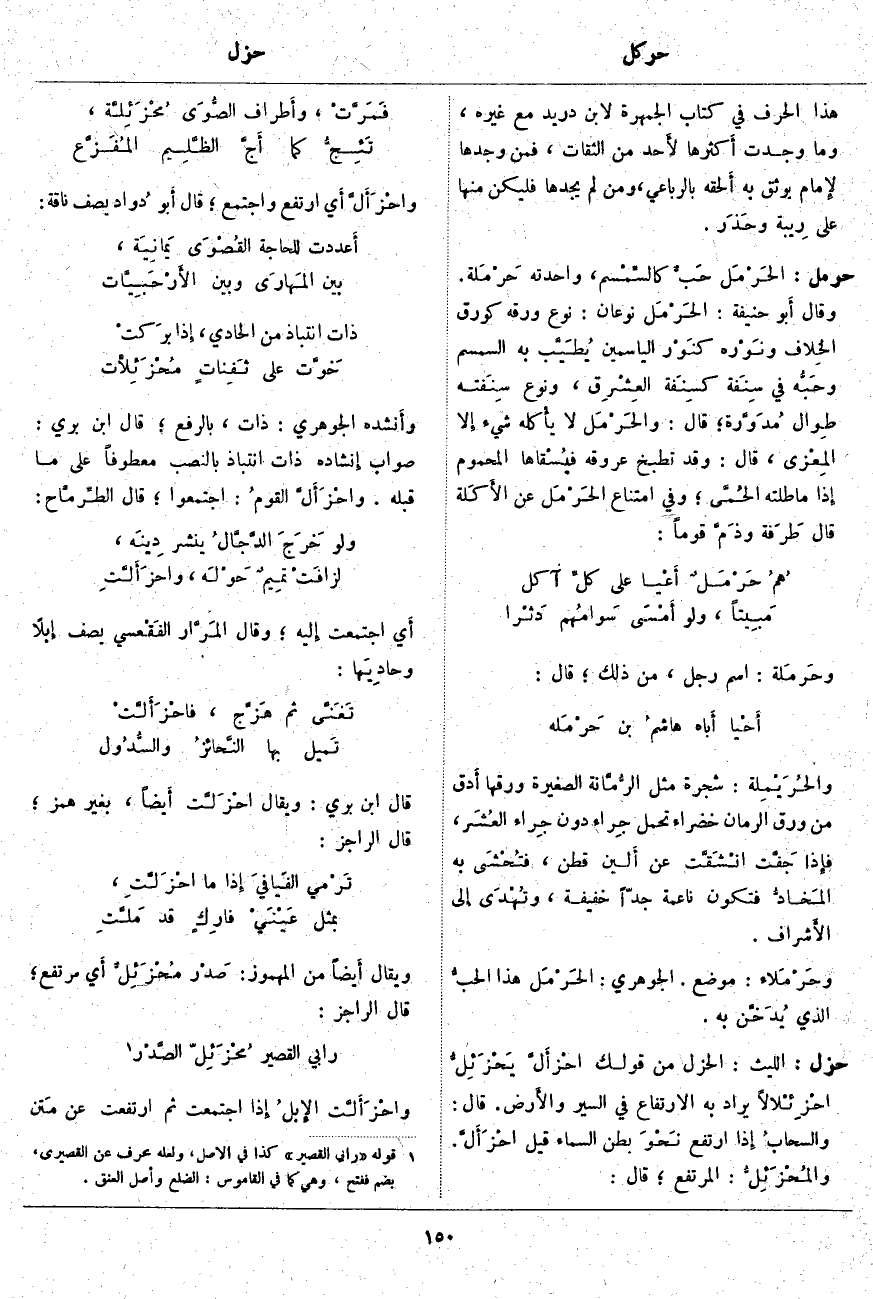 حرمل: الحَرْمَل حَبٌّ كالسِّمْسم، وَاحِدَتُهُ حَرْمَلَة. وَقَالَ أَبو حَنِيفَةَ: الحَرْمَل نَوْعَانِ: نَوْعٌ وَرَقُهُ كَوَرَقِ الخِلاف ونَوْره كنَوْر الْيَاسَمِينَ يُطَيَّب بِهِ السِّمْسِمِ وحَبُّه فِي سِنَفة كسِنَفة العِشْرِق، وَنَوْعٌ سِنَفته طِوال مُدَوَّرة؛ قَالَ: والحَرْمَل لَا يأْكله شَيْءٌ إِلا المِعْزى، قَالَ: وَقَدْ تُطْبَخُ عُرُوقُهُ فيُسْقاها الْمَحْمُومُ إِذا مَاطَلَتْهُ الحُمَّى؛ وَفِي امْتِنَاعِ الحَرْمَل عَنِ الأَكَلة قَالَ طَرَفة وذَمَّ قَوْمًا: