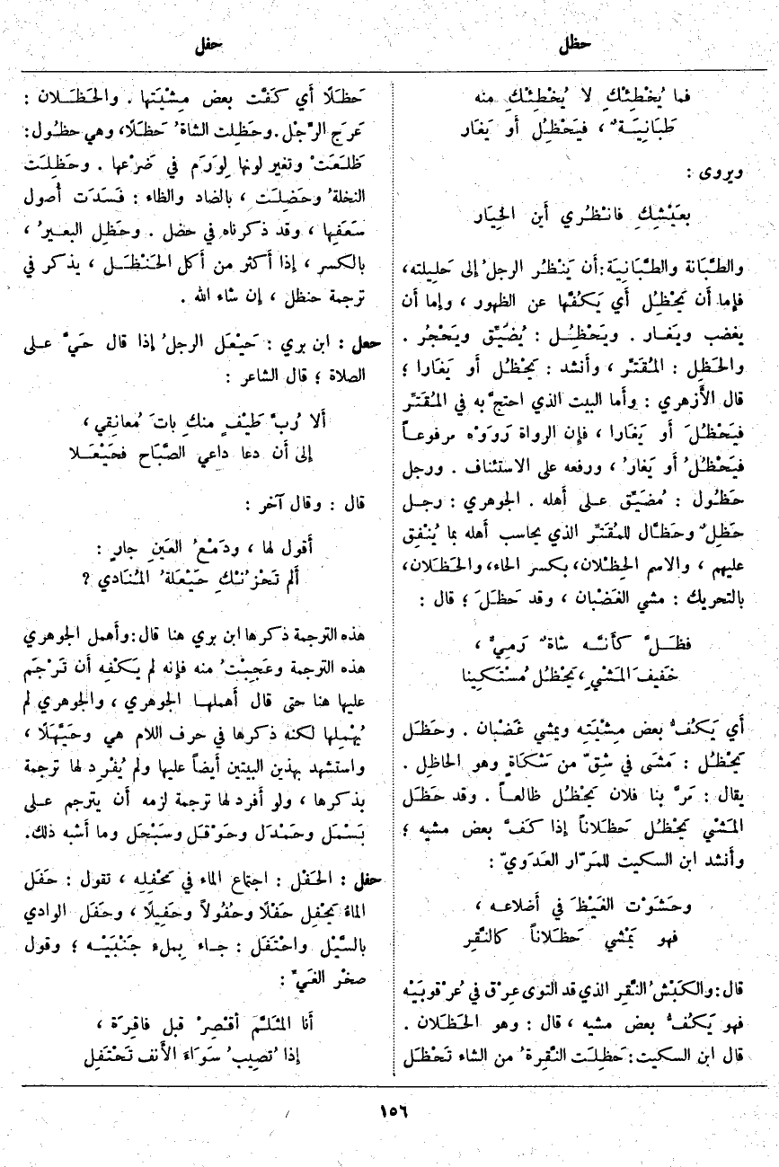 حفل: الحَفْل: اجْتِمَاعُ الْمَاءِ فِي مَحْفِلِه، تَقُولُ: حَفَلَ الماءُ يَحْفِلُ حَفْلًا وحُفُولًا وحَفِيلًا، وحَفَلَ الْوَادِي بالسَّيْل واحْتَفَلَ: جَاءَ بِملءِ جَنْبَيْه؛ وَقَوْلُ صخْر الغَيِّ:
