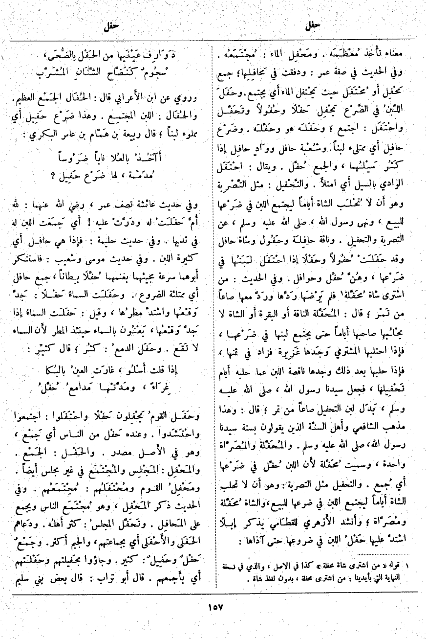 ؛ جَمْعُ مَحْفِل أَو مُحْتَفَل حَيْثُ يَحْتَفِلُ الْمَاءُ أَي يَجْتَمِعُ. وحَفَلَ اللَّبنُ فِي الضَّرْع يَحْفِلُ حَفْلًا وحُفُولًا وتَحَفَّلَ واحْتَفَلَ: اجْتَمَعَ؛ وحَفَلَه هُوَ وحَفَّلَه. وضَرْع حَافِل أَي مُمْتَلِئٌ لَبَنًا. وشُعْبة حَافِل ووَادٍ حَافِل إِذا كَثُر سَيْلُهما، وَالْجَمْعُ حُفَّل. وَيُقَالُ: احْتَفَلَ الْوَادِي بِالسَّيْلِ أَي امتلأَ. والتَّحْفِيل: مِثْلُ التَّصْرِية وَهُوَ أَن لَا تُحْلَب الشَّاةُ أَياماً لِيَجْتَمِعَ اللَّبَنُ فِي ضَرْعها لِلْبَيْعِ،
