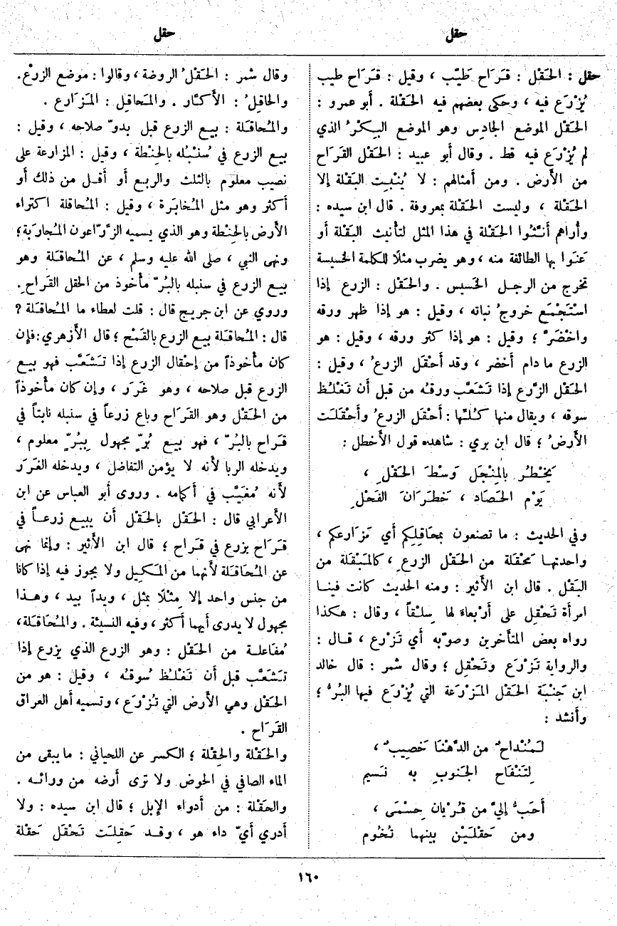 وَقَالَ شَمِرٌ: الحَقْلُ الرَّوْضَةُ، وَقَالُوا: مَوْضِعُ الزرْع. والحَاقِلُ: الأَكَّار. والمَحَاقِل: المَزَارع. والمُحَاقَلة: بَيْعُ الزَّرْعِ قَبْلَ بُدُوِّ صَلَاحِهِ، وَقِيلَ: بَيْعُ الزَّرْعِ فِي سُنْبُله بالحِنْطة، وَقِيلَ: الْمُزَارَعَةَ عَلَى نَصِيبٍ مَعْلُومٍ بِالثُّلْثِ وَالرُّبْعِ أَو أَقل مِنْ ذَلِكَ أَو أَكثر وَهُوَ مِثْلُ المُخابَرة، وَقِيلَ: المُحَاقَلَة اكْتِرَاءُ الأَرض بالحِنْطة وَهُوَ الَّذِي يُسَمِّيهِ الزَّرّاعون المُجارَبة؛ وَنَهَى