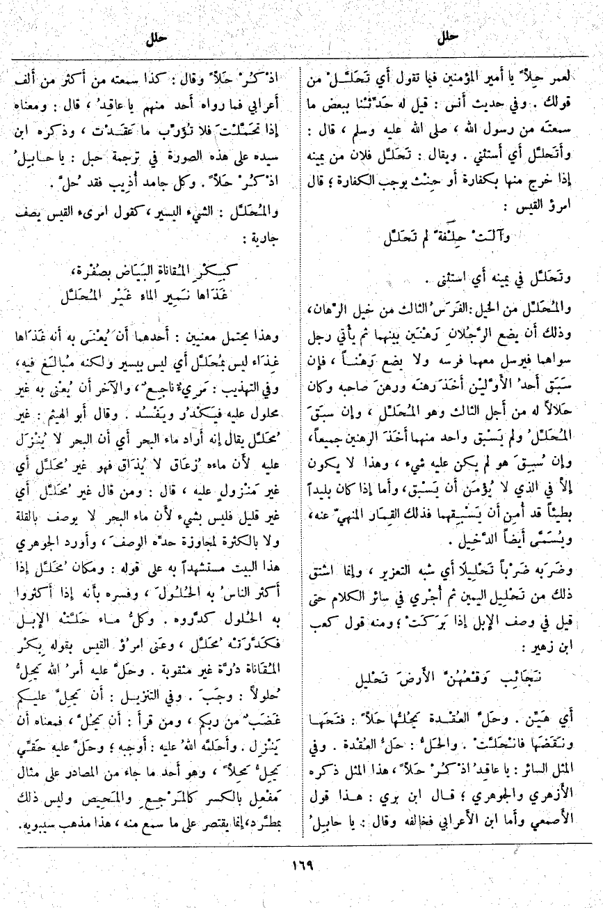 وَهَذَا يَحْتَمِلُ مَعْنَيَيْنِ: أَحدهما أَن يُعْنَى بِهِ أَنه غَذَاها غِذَاء لَيْسَ بمُحَلَّل أَي لَيْسَ بِيَسِيرٍ وَلَكِنَّهُ مُبالَغ فِيهِ، وَفِي التَّهْذِيبِ: مَرِيءٌ ناجِعٌ، وَالْآخَرُ أَن يُعْنى بِهِ غَيْرُ مَحْلُولٍ عَلَيْهِ فيَكْدُر ويَفْسُد. وَقَالَ أَبو الْهَيْثَمِ: غَيْرُ مُحَلَّل يُقَالُ إِنه أَراد مَاءَ الْبَحْرِ أَي أَن الْبَحْرَ لَا يُنْزَل عَلَيْهِ لأَن مَاءَهُ زُعَاق لَا يُذَاق فَهُوَ غَيْرُ مُحَلَّل أَي غَيْرُ مَنْزولٍ عَلَيْهِ، قَالَ: وَمَنْ قَالَ غَيْرُ مُحَلَّل أَي غَيْرُ قَلِيلٍ فَلَيْسَ بِشَيْءٍ لأَن مَاءَ الْبَحْرِ لَا يُوصَفُ بِالْقِلَّةِ وَلَا بِالْكَثْرَةِ لِمُجَاوَزَةِ حدِّه الوصفَ، وأَورد الْجَوْهَرِيُّ هَذَا الْبَيْتَ مُسْتَشْهِدًا بِهِ عَلَى قَوْلِهِ: وَمَكَانٌ مُحَلَّل إِذا أَكثر الناسُ بِهِ الحُلُولَ، وَفَسَّرَهُ بأَنه إِذا أَكثروا بِهِ الحُلول كدَّروه. وكلُّ مَاءٍ حَلَّتْه الإِبل فكَدَّرَتْه مُحَلَّل، وعَنى إمرُؤ الْقَيْسِ بِقَوْلِهِ بِكْر المُقَاناة دُرَّة غَيْرَ مَثْقُوبَةٍ. وحَلَّ عَلَيْهِ أَمرُ اللَّهِ يَحِلُّ حُلولًا: وجَبَ. وَفِي التَّنْزِيلِ: أَنْ يَحِلَّ عَلَيْكُمْ غَضَبٌ مِنْ رَبِّكُمْ