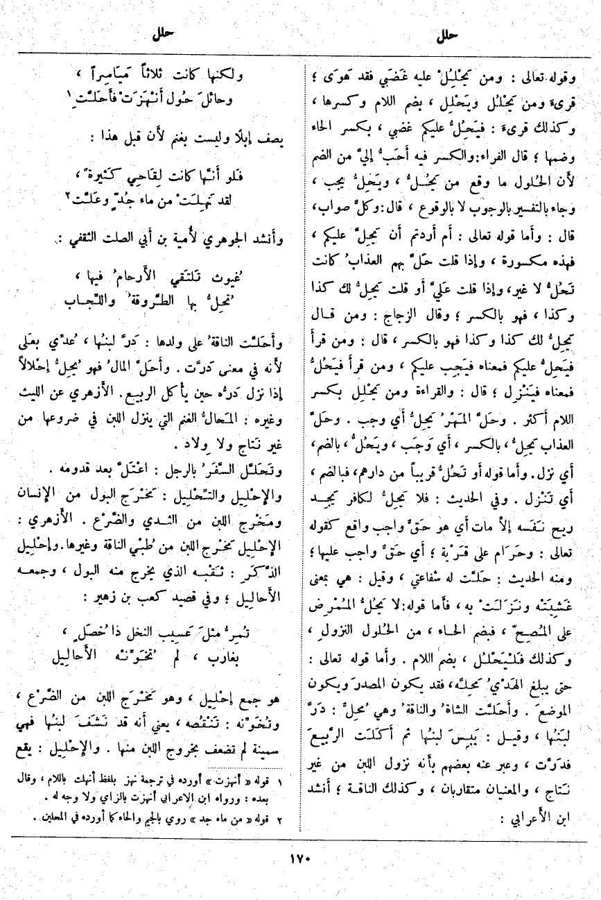 ، فَقَدْ يَكُونُ المصدرَ وَيَكُونُ الموضعَ. وأَحَلَّت الشاةُ والناقةُ وَهِيَ مُحِلٌّ: دَرَّ لبَنُها، وَقِيلَ: يَبِسَ لبنُها ثُمَّ أَكَلَت الرَّبيعَ فدَرَّت، وَعَبَّرَ عَنْهُ بَعْضُهُمْ بأَنه نُزُولُ اللَّبَنِ مِنْ غَيْرِ نِتاج، وَالْمَعْنَيَانِ مُتَقَارِبَانِ، وَكَذَلِكَ النَّاقَةُ؛ أَنشد ابْنُ الأَعرابي: