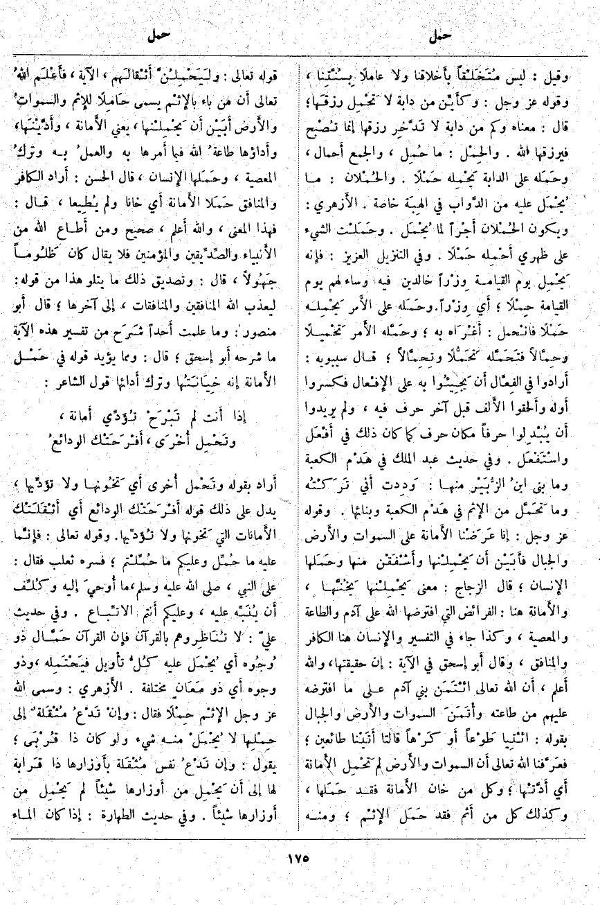 ، الْآيَةَ، فأَعْلم اللهُ تَعَالَى أَن مَنْ بَاءَ بالإِثْم يُسَمَّى حَامِلًا للإِثم والسماواتُ والأَرض أَبَيْن أَن يَحْمِلْنها، يَعْنِي الأَمانة. وأَدَّيْنَها، وأَداؤها طاعةُ اللَّهِ فِيمَا أَمرها بِهِ والعملُ بِهِ وتركُ الْمَعْصِيَةِ، وحَمَلها الإِنسان، قَالَ الْحَسَنُ: أَراد الْكَافِرَ وَالْمُنَافِقَ حَمَلا الأَمانة أَي خَانَا وَلَمْ يُطِيعا، قَالَ: فَهَذَا الْمَعْنَى، وَاللَّهُ أَعلم، صَحِيحٌ وَمَنْ أَطاع اللَّهَ مِنَ الأَنبياء والصِّدِّيقين وَالْمُؤْمِنِينَ فَلَا يُقَالُ كَانَ ظَلُوماً جَهُولًا، قَالَ: وَتَصْدِيقُ ذَلِكَ مَا يَتْلُو هَذَا مِنْ قَوْلُهُ: لِيُعَذِّبَ اللَّهُ الْمُنافِقِينَ وَالْمُنافِقاتِ، إِلى آخِرِهَا؛ قَالَ أَبو مَنْصُورٍ: وَمَا عَلِمْتُ أَحداً شَرَح مِنْ تَفْسِيرِ هَذِهِ الْآيَةِ مَا شَرَحَهُ أَبو إِسحاق؛ قَالَ: وَمِمَّا يُؤَيِّدُ قَوْلَهُ فِي حَمْل الأَمانة إِنه خِيَانَتُها وَتَرْكُ أَدائها قَوْلُ الشَّاعِرِ: