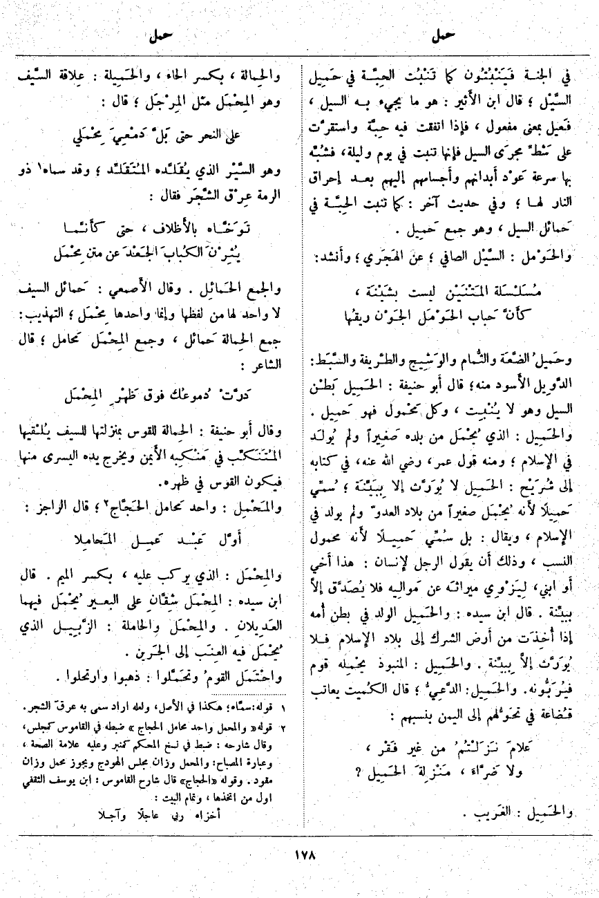 وَقَالَ أَبو حَنِيفَةَ: الحِمَالَة لِلْقَوْسِ بِمَنْزِلَتِهَا لِلسَّيْفِ يُلْقيها المُتَنَكِّب فِي مَنْكِبه الأَيمن وَيُخْرِجُ يَدَهُ الْيُسْرَى مِنْهَا فَيَكُونُ الْقَوْسُ فِي ظَهْرِهِ. والمَحْمِل: وَاحِدُ مَحَامِل الحَجَّاج «2». قَالَ الرَّاجِزُ: