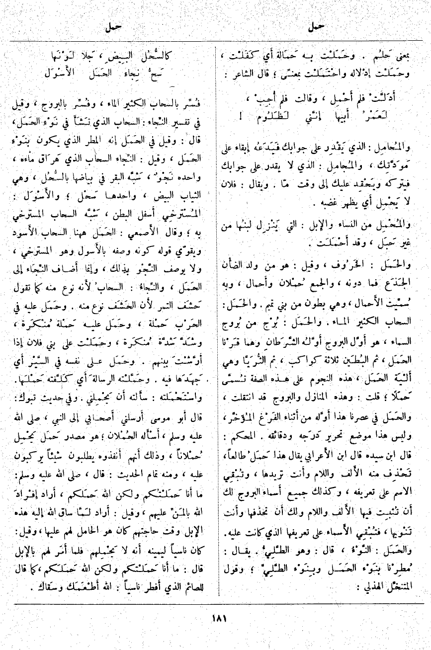والمُحَامِل: الَّذِي يَقْدِر عَلَى جَوَابِكَ فَيَدَعُه إِبقاء عَلَى مَوَدَّتِك، والمُجامِل: الَّذِي لَا يَقْدِرُ عَلَى جَوَابِكَ فَيَتْرُكُهُ ويَحْقِد عَلَيْكَ إِلى وَقْتٍ مَا. وَيُقَالُ: فُلَانٌ لَا يَحْمِل أَي يَظْهَرُ غَضَبُهُ. والمُحْمِل مِنَ النِّسَاءِ والإِبل: الَّتِي يَنْزِل لبنُها مِنْ غَيْرِ حَبَل، وَقَدْ أَحْمَلَت. والحَمَل: الخَرُوف، وَقِيلَ: هُوَ مِنْ وَلَدِ الضأْن الجَذَع فَمَا دُونَهُ، وَالْجَمْعُ حُمْلان وأَحْمَال، وَبِهِ سُمِّيت الأَحْمَال، وَهِيَ بُطُونٌ مِنْ بَنِي تَمِيمٍ. والحَمَل: السَّحَابُ الْكَثِيرُ الْمَاءِ. والحَمَل: بُرْج مِنْ بُروج السَّمَاءِ، هُوَ أَوَّل الْبُرُوجِ أَوَّلُه الشَّرَطانِ وَهُمَا قَرْنا الحَمَل، ثُمَّ البُطَين ثَلَاثَةُ كَوَاكِبَ، ثُمَّ الثُّرَيَّا وَهِيَ أَلْيَة الحَمَل، هَذِهِ النُّجُومُ عَلَى هَذِهِ الصِّفَةِ تُسَمَّى حَمَلًا؛ قُلْتُ: وَهَذِهِ الْمَنَازِلُ وَالْبُرُوجُ قَدِ انْتَقَلَتْ، والحَمَل فِي عَصْرِنَا هَذَا أَوَّله مِنْ أَثناء الفَرْغ المُؤَخَّر، وَلَيْسَ هَذَا مَوْضِعَ تَحْرِيرِ دَرَجه وَدَقَائِقِهِ. الْمُحْكَمُ: قَالَ ابْنُ سِيدَهْ قَالَ ابْنُ الأَعرابي يُقَالُ هَذَا حَمَلُ طَالِعًا، تَحْذِف مِنْهُ الأَلف وَاللَّامَ وأَنت تُرِيدُهَا، وتُبْقِي الِاسْمَ عَلَى تَعْرِيفِهِ، وَكَذَلِكَ جَمِيعُ أَسماء الْبُرُوجِ لَكَ أَن تُثْبِت فِيهَا الأَلف وَاللَّامَ وَلَكَ أَن تَحْذِفَهَا وأَنت تَنْويها، فتُبْقِي الأَسماء عَلَى تَعْرِيفِهَا الَّذِي كَانَتْ عَلَيْهِ. والحَمَل: النَّوْءُ، قَالَ: وَهُوَ الطَّلِيُّ. يُقَالُ: مُطِرْنا بنَوْء الحَمَل وبِنَوْء الطَّلِيِّ؛ وَقَوْلُ المتنخِّل الْهُذَلِيُّ: