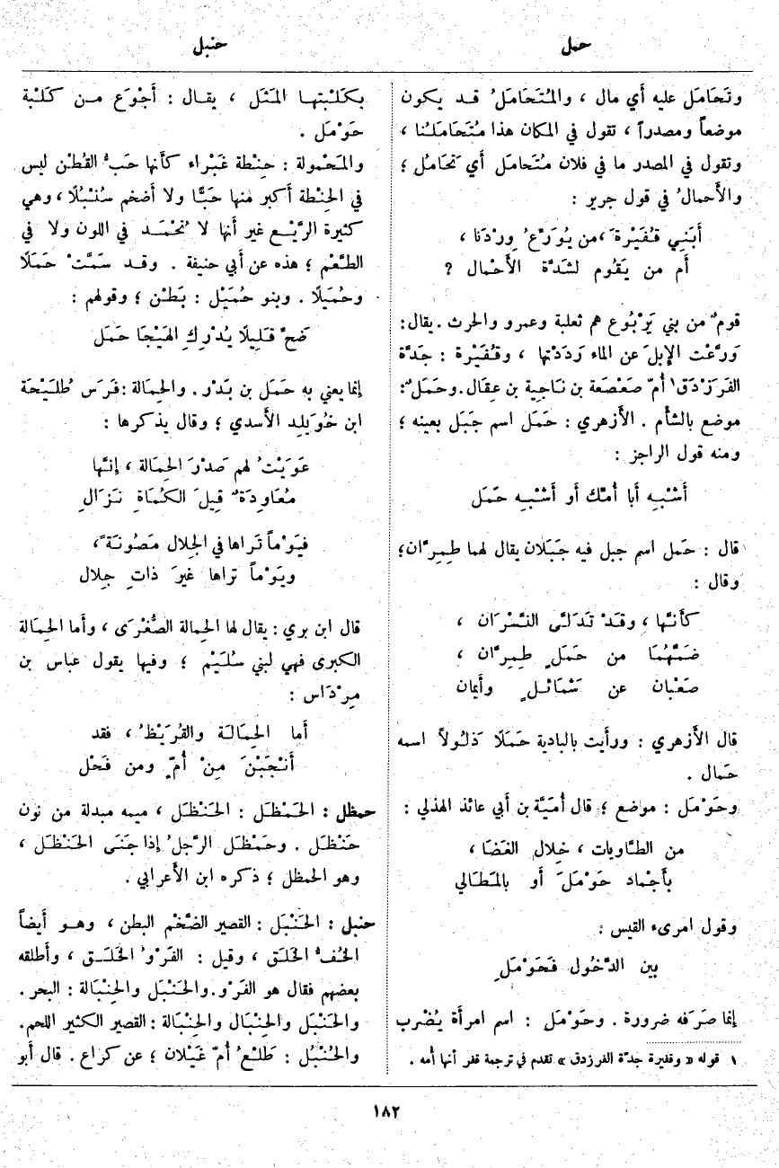 حنبل: الحَنْبَل: الْقَصِيرُ الضَّخْم الْبَطْنِ، وَهُوَ أَيضاً الخُفُّ الخَلَق، وَقِيلَ: الفرْوُ الخَلَق، وأَطلقه بَعْضُهُمْ فَقَالَ هُوَ الفَرْو. والحَنْبَل والحِنْبَالة: الْبَحْرُ. والحَنْبَل والحِنْبَال والحِنْبَالة: الْقَصِيرُ الْكَثِيرُ اللَّحْمِ. والحُنْبُل: طَلْعُ أُمّ غَيْلان؛ عَنْ كُرَاعٍ. قَالَ أَبو