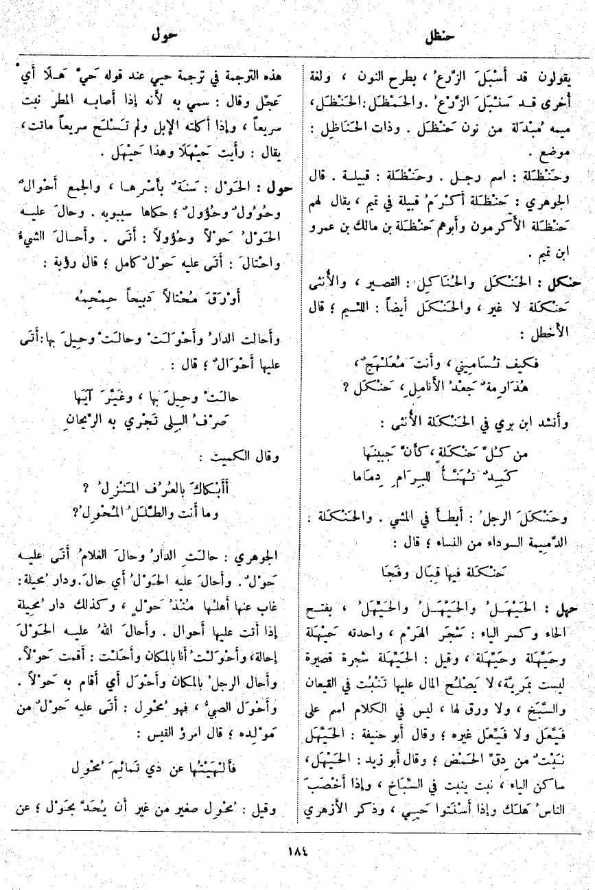 حول: الحَوْل: سَنَةٌ بأَسْرِها، والجمع أَحْوالٌ وحُوُولٌ وحُؤُولٌ؛ حَكَاهَا سِيبَوَيْهِ. وحَالَ عَلَيْهِ الحَوْلُ حَوْلًا وحُؤُولًا: أَتَى. وأَحَالَ الشيءُ واحْتَالَ: أَتَى عَلَيْهِ حَوْلٌ كَامِلٌ؛ قَالَ رُؤْبَةُ: