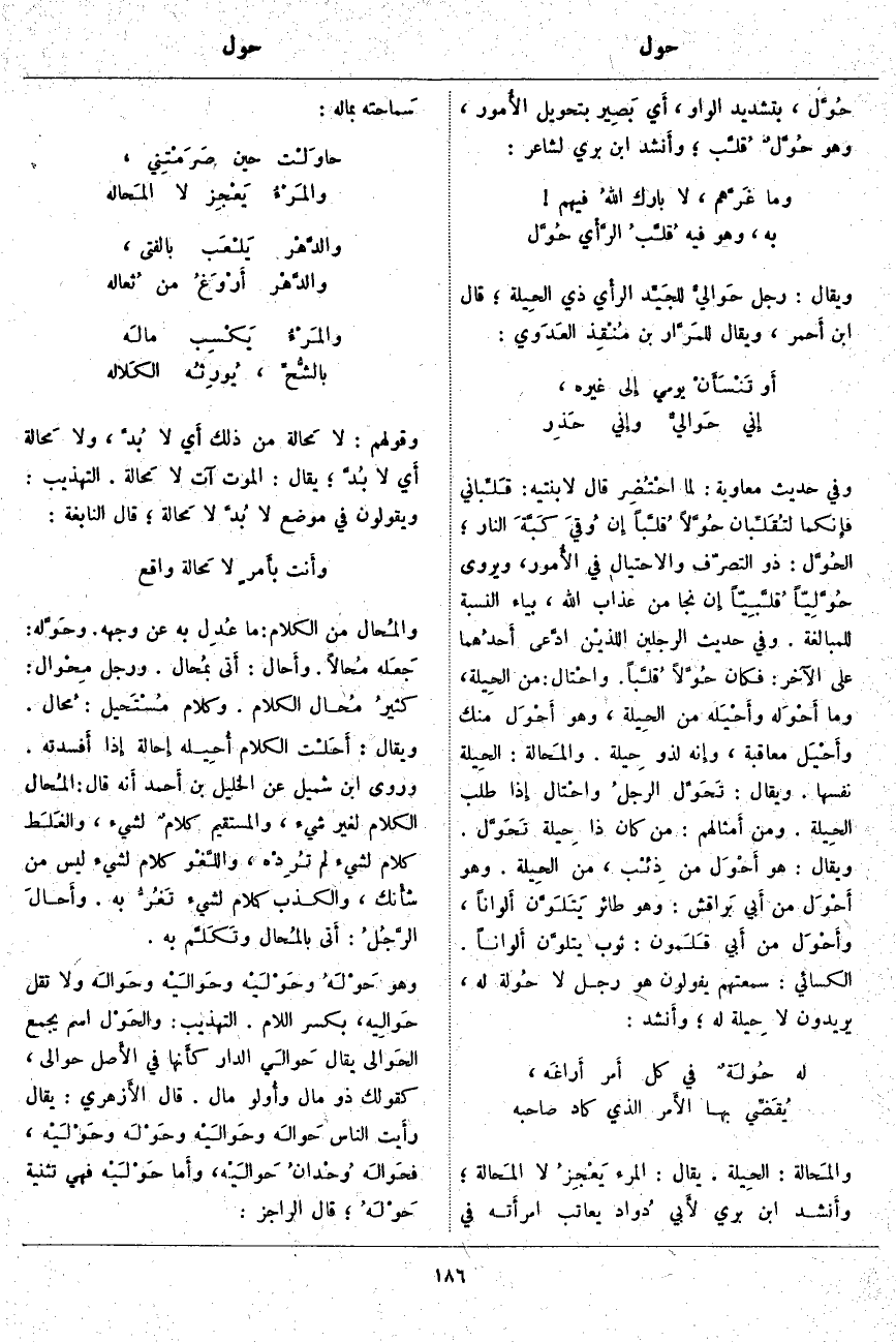 والمُحال مِنَ الْكَلَامِ: مَا عُدِل بِهِ عَنْ وَجْهِهِ. وحَوَّله: جَعَله مُحالًا. وأَحال: أَتى بمُحال. وَرَجُلٌ مِحْوال: كثيرُ مُحال الْكَلَامِ. وَكَلَامٌ مُسْتَحِيل: مُحال. وَيُقَالُ: أَحَلْت الْكَلَامَ أُحِيلُهُ إِحَالَة إِذا أَفسدته. وَرَوَى ابْنُ شُمَيْلٍ عَنِ الْخَلِيلِ بْنِ أَحمد أَنه قَالَ: المُحَال الْكَلَامُ لِغَيْرِ شَيْءٍ، وَالْمُسْتَقِيمُ كلامٌ لِشَيْءٍ، والغَلَط كَلَامٌ لِشَيْءٍ لَمْ تُرِدْه، واللَّغْو كَلَامٌ لِشَيْءٍ لَيْسَ مِنْ شأْنك، وَالْكَذِبُ كَلَامٌ لِشَيْءٍ تَغُرُّ بِهِ. وأَحالَ الرَّجُلُ: أَتَى بالمُحال وتَكَلَّم بِهِ. وَهُوَ حَوْلَهُ وحَوْلَيْه وحَوالَيْه وحَوالَه وَلَا تَقُلْ حَوالِيه، بِكَسْرِ اللَّامِ. التَّهْذِيبِ: والحَوْل اسْمٌ يُجْمَعُ الحَوالى يُقَالُ حَوالَي الدَّارِ كأَنها فِي الأَصل حَوَالَيْ، كَقَوْلِكَ ذُو مَالٍ وأُولو مَالٍ. قَالَ الأَزهري: يُقَالُ رأَيت النَّاسَ حَوالَه وحَوالَيْه وحَوْلَه وحَوْلَيْه، فحَوالَه وُحْدانُ حَوالَيْه، وأَما حَوْلَيْه فَهِيَ تَثْنِيَةُ حَوْلَه؛ قَالَ الرَّاجِزُ: