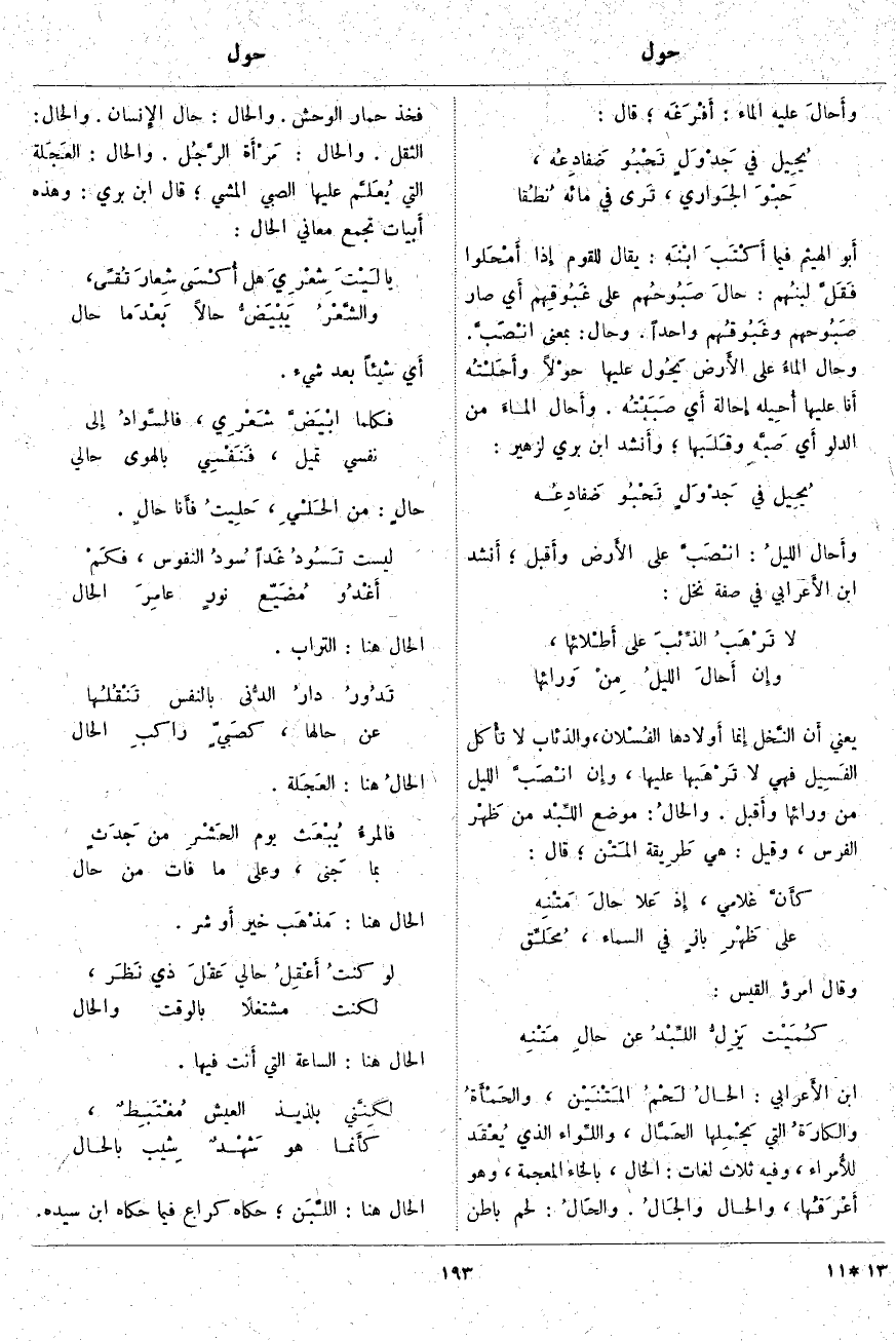 ابْنُ الأَعرابي: الحَالُ لَحْمُ المَتْنَيْن، والحَمْأَةُ والكارَةُ الَّتِي يَحْمِلها الحَمَّال، واللِّواء الَّذِي يُعْقَد للأُمراء، وَفِيهِ ثَلَاثُ لُغَاتٍ: الْخَالُ، بِالْخَاءِ الْمُعْجَمَةِ، وَهُوَ أَعْرَقُها، والحَال والجَالُ. والحَالُ: لَحْمُ بَاطِنِ فَخِذِ حِمَارِ الْوَحْشِ. والحَال: حَالُ الإِنسان. والحَال: الثِّقْلُ. والحَال: مَرْأَة الرَّجُل. والحَال: العَجَلة الَّتِي يُعَلَّم عَلَيْهَا الصَّبِيُّ الْمَشْيَ؛ قَالَ ابْنُ بَرِّيٍّ: وَهَذِهِ أَبيات تَجْمَعُ مَعَانِيَ الحَال: