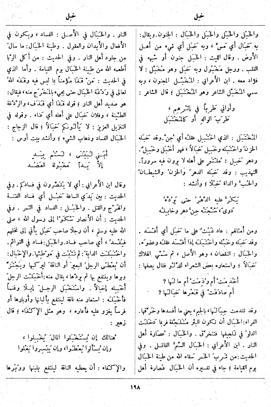 وَقَدْ تَقَدَّمَتْ جِبَالَها، بِالْجِيمِ، يَعْنِي مَا أَفسدها وخَرَّقها. الْفَرَّاءُ: الخَبَال أَن تَكُونَ الْبِئْرُ مُتَلَجِّفة فَرُبَّمَا دَخَلَت الدلوُ فِي تَلجيفها فتتخرَّق. والخَبَال: عُصَارة أَهل النَّارِ. ابْنُ الأَعرابي: الخَبَال السَّمُّ الْقَاتِلُ. وَفِي الْحَدِيثِ:
