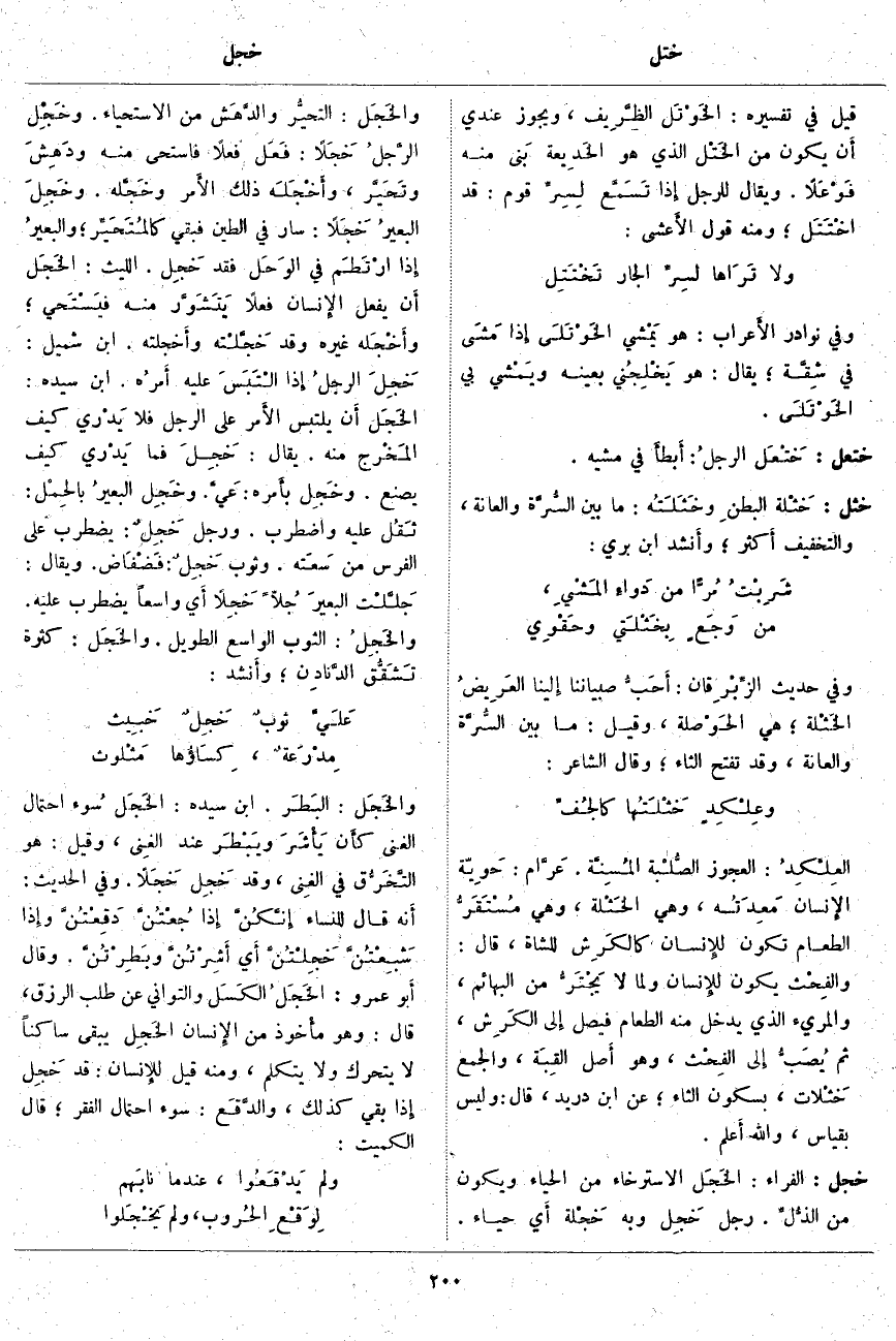 خجل: الْفَرَّاءُ: الخَجَل الِاسْتِرْخَاءُ مِنَ الْحَيَاءِ وَيَكُونُ مِنَ الذُّلِّ. رَجُلٌ خَجِل وَبِهِ خَجْلة أَي حَيَاءٌ. والخَجَل: التحيُّر والدَّهَش مِنَ الِاسْتِحْيَاءِ. وخَجِل الرَّجلُ خَجَلًا: فَعَل فِعْلًا فَاسْتَحَى مِنْهُ ودَهِشَ وتَحَيَّر، وأَخْجَلَه ذَلِكَ الأَمر وخَجَّلَه. وخَجِلَ البعيرُ خَجَلًا: سَارَ فِي الطِّينِ فَبَقِيَ كالمُتَحَيِّر؛ والبعيرُ إِذا ارْتَطَم فِي الوَحَل فَقَدْ خَجِل. اللَّيْثُ: الخَجَل أَن يَفْعَلَ الإِنسان فِعْلًا يَتَشَوَّر مِنْهُ فيَسْتَحي؛ وأَخْجَلَه غَيْرُهُ وَقَدْ خَجَّلْته وأَخْجَلْته. ابْنُ شُمَيْلٍ: خَجِلَ الرجلُ إِذا الْتَبَسَ عَلَيْهِ أَمرُه. ابْنُ سِيدَهْ: الخَجَل أَن يَلْتَبِسَ الأَمر عَلَى الرَّجُلِ فَلَا يَدْري كَيْفَ المَخْرج مِنْهُ. يُقَالُ: خَجِلَ فَمَا يَدْري كَيْفَ يَصْنَعُ. وخَجِل بأَمره: عَيَّ. وخَجِلَ البعيرُ بالحِمْل: ثَقُل عَلَيْهِ وَاضْطَرَبَ. وَرَجُلٌ خَجِلٌ: يَضْطَرِبُ عَلَى الْفَرَسِ مِنْ سَعَته. وَثَوْبٌ خَجِلٌ: فَضْفَاض. وَيُقَالُ: جَلَّلْت البعيرَ جُلًّا خَجِلًا أَي وَاسِعًا يَضْطَرِبُ عَلَيْهِ. والخَجِلُ: الثَّوْبُ الْوَاسِعُ الطَّوِيلُ. والخَجَل: كَثْرَةُ تَشَقُّق الدَّنادِن؛ وأَنشد: