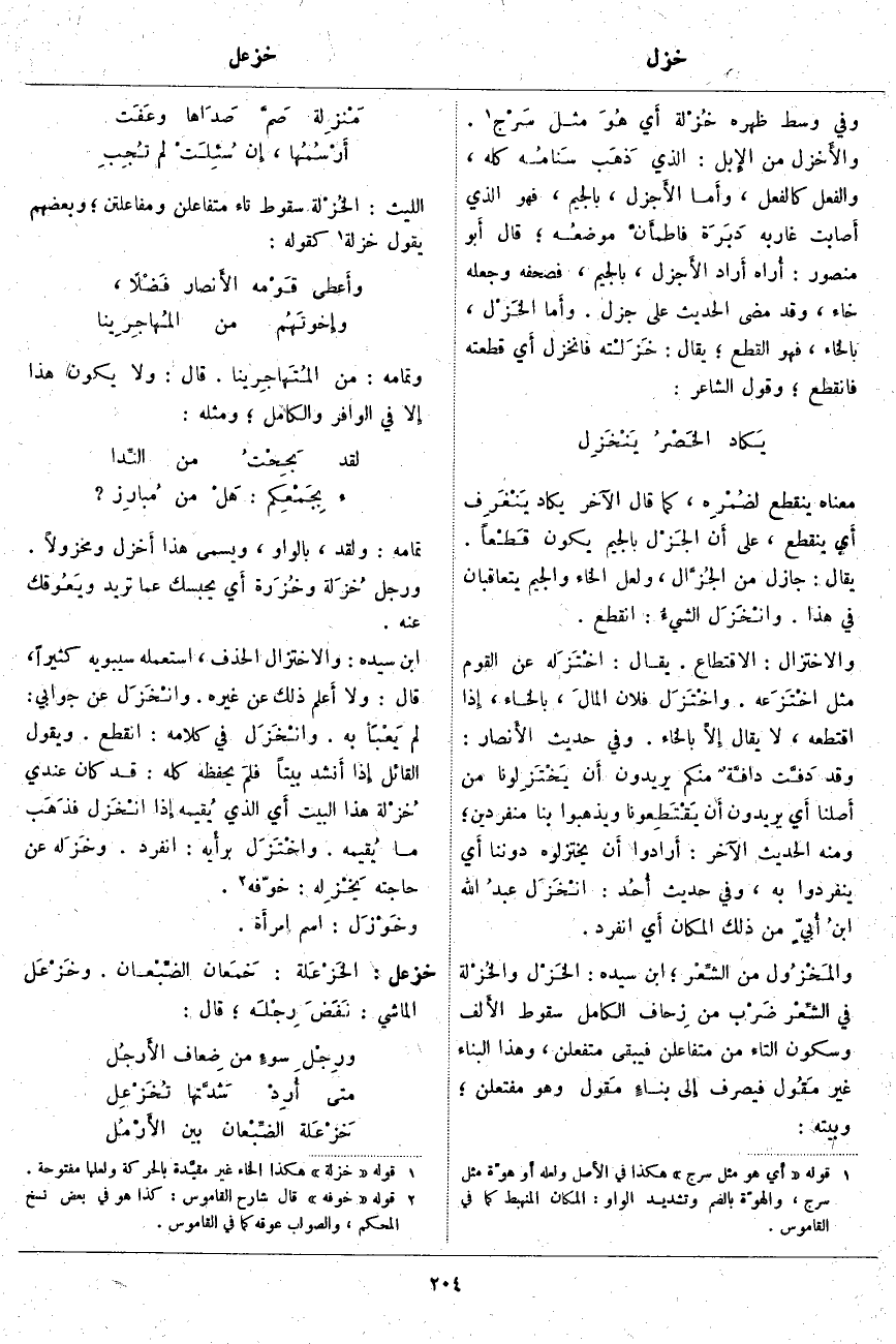 اللَّيْثُ: الخُزْلة سُقُوطُ تَاءِ مُتَفَاعِلُنْ وَمُفَاعَلَتُنْ؛ وَبَعْضُهُمْ يَقُولُ خُزْلَةٌ «2» كَقَوْلِهِ: