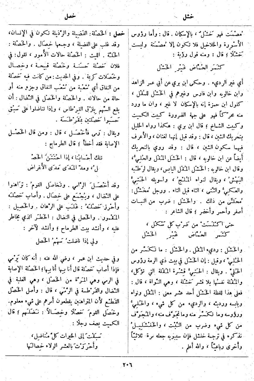 أَي غَيْرِ الرَّدِيءِ. وَحَكَى ابْنُ بَرِّيٍّ عَنِ أَبي عُمَرَ الزَّاهِدِ وَابْنِ خَالَوَيْهِ وَابْنِ فَارِسٍ وَغَيْرِهِمْ فِي الخَشْل للمُقْل، كَقَوْلِ ابْنِ حَمْزَةَ إِنه بالإِسكان لَا غَيْرُ، وَإِنَّ مَا وَرَدَ مِنْهُ مُحَرَّكًا فَهُوَ عَلَى جِهَةِ الضَّرُورَةِ كَبَيْتِ الْكُمَيْتِ وَكَبَيْتِ الشَّمَّاخِ؛ قَالَ ابْنُ بَرِّيٍّ: هَكَذَا رَوَاهُ الْخَلِيلُ بِتَحْرِيكِ الشِّينِ، قَالَ: وَقَدْ قِيلَ إِنهما لُغَتَانِ، والأَعرف فِيهِمَا سُكُونُ الشِّينِ، قَالَ: وَقَدْ رُوِيَ بِالتَّحْرِيكِ أَيضاً عَنِ ابْنِ خَالَوَيْهِ، قَالَ: الخَشَل المُقْل والحُلِيُّ، وَقَالَ ابْنُ خَالَوَيْهِ: الخَشْل المُقْل الْيَابِسُ، وَيُقَالُ لرَطْبه البَهْشُ، وَيُقَالُ لِنَوَاهُ المُلْجُ، وَلِسَوِيقِهِ الحَتِيُّ والعَكِيُّ والثَّتى، الثَّاءُ قَبْلَ التَّاءِ. وَرَجُلٌ مُخَشَّل: مُحَلَّى مِنْ ذَلِكَ. والخَشْل: ضَرْبٌ مِنَ النَّبَاتِ أَصفر وأَحمر وأَخضر؛ قَالَ الشَّاعِرُ: