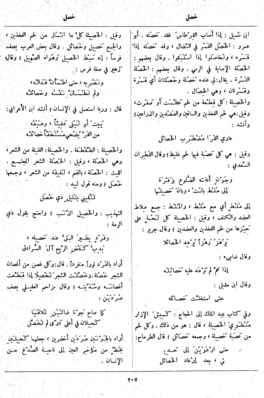 ابْنُ شُمَيْلٍ: إِذا أَصاب القِرْطاسَ فَقَدْ خَصَلَه. أَبو عَمْرٍو: الخَصْل القَمْر فِي النِّضال، وَقَدْ خَصَلَه إِذا قَمَره، وتَخَاصَلوا إِذا اسْتَبَقوا. وَقَالَ بَعْضُهُمْ: الخَصْلة الإِصابة فِي الرَّمْيِ. وَقَالَ بَعْضُهُمْ: الخَصْلَة القَمْرة. يُقَالُ: لِي عِنْدَهُ خَصْلَة وَخَصْلَتان أَي قَمْرة وقَمْرتان، وَهِيَ الخِصَال. والخَصِيلة: كُلُّ قِطْعة مِنْ لَحْمٍ عَظُمَت أَو صَغُرت، وَقِيلَ: هِيَ لَحْمُ الْفَخْذَيْنِ وَالسَّاقَيْنِ والعَضُدين وَالذِّرَاعَيْنِ؛ وأَنشد: