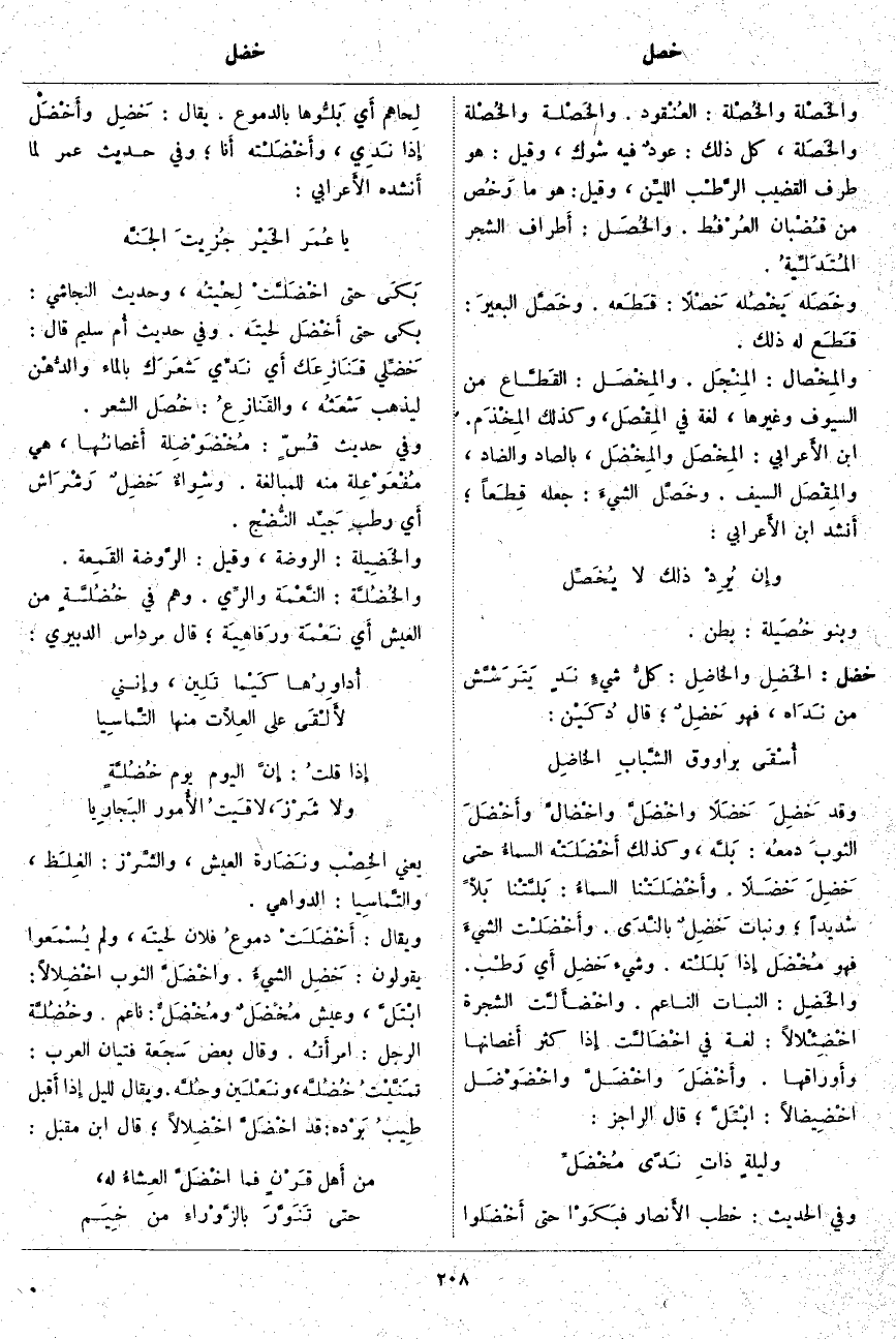 خضل: الخَضِل والخَاضِل: كلُّ شيءٍ نَدٍ يَتَرَشَّش مِنْ نَدَاه، فَهُوَ خَضِلٌ؛ قَالَ دُكَيْن: