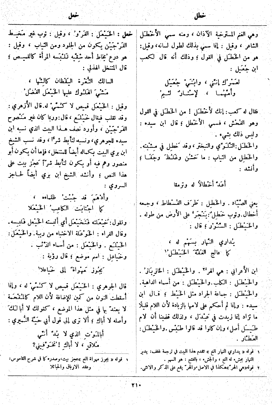 فَقَالَ لَهُ كَعْبٌ: إِنك لأَخْطَل مِنَ الخَطَل فِي الْقَوْلِ وَهُوَ الفُحْش، فَسُمِّيَ الأَخْطَل؛ قَالَ ابْنُ سِيدَهْ: وَلَيْسَ ذَلِكَ بِشَيْءٍ. والخَطَل: التَّلَوِّي وَالتَّبَخْتُرُ، وَقَدْ خَطِلَ فِي مِشْيته. والخَطِل مِنَ الثِّيَابِ: مَا خَشُن وغَلُظَ وجَفَا؛ وأَنشد: