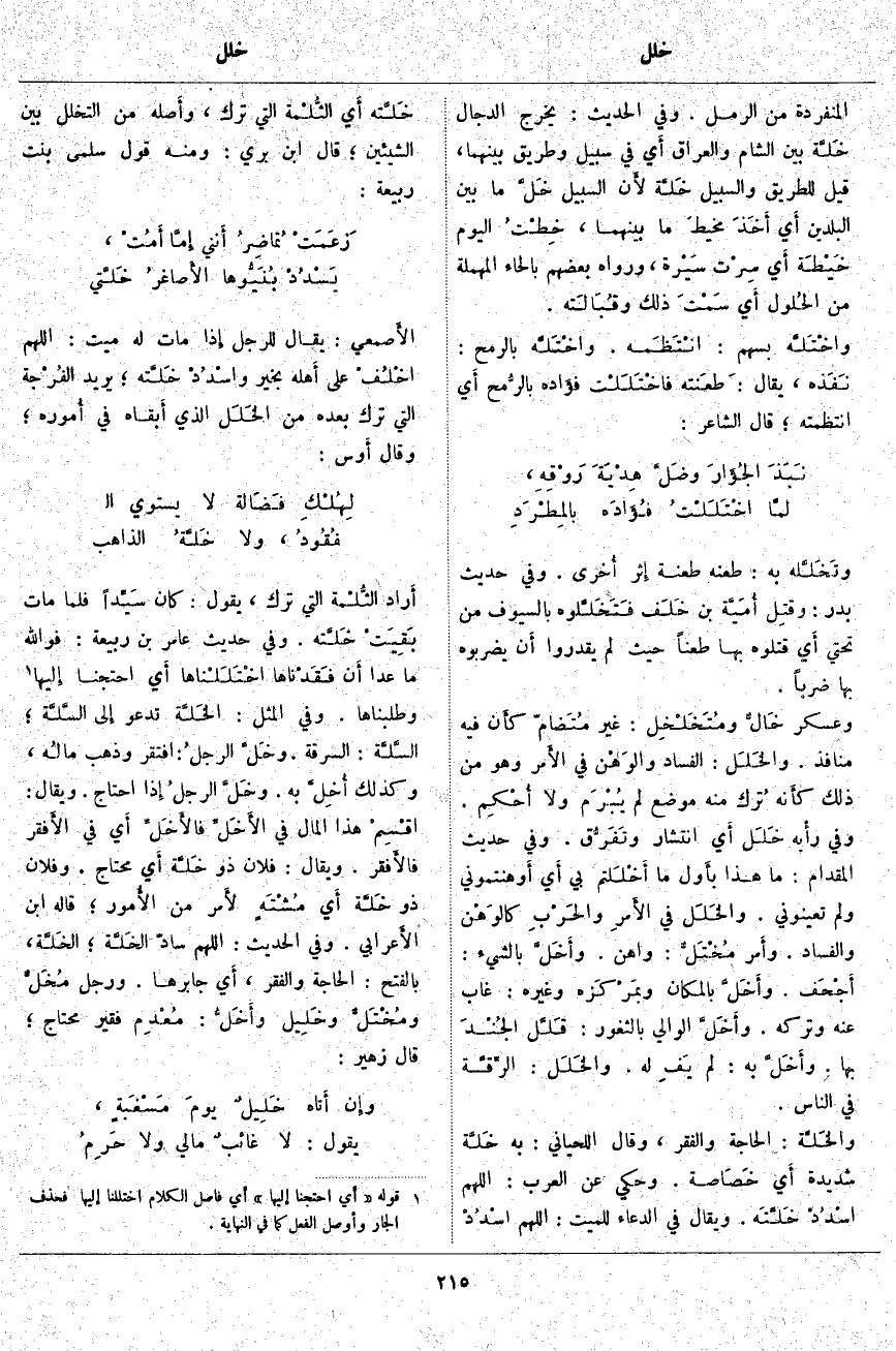 ؛ الخَلَّة، بِالْفَتْحِ: الْحَاجَةُ وَالْفَقْرُ، أَي جَابِرُهَا. وَرَجُلٌ مُخَلٌّ ومُخْتَلٌّ وخَلِيل وأَخَلُّ: مُعْدِم فَقِيرٌ مُحْتَاجٌ؛ قَالَ زُهَيْرٌ: