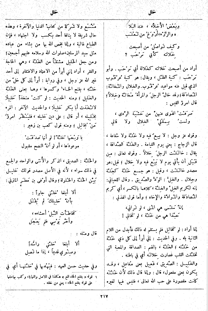 ؛ الخُلَّة، بِالضَّمِّ: الصَّدَاقَةُ وَالْمَحَبَّةُ الَّتِي تخلَّلت الْقَلْبَ فَصَارَتْ خِلالَه أَي فِي بَاطِنِهِ. والخَلِيل: الصَّدِيق، فَعِيل بِمَعْنَى مُفَاعِل، وَقَدْ يَكُونُ بِمَعْنَى مَفْعُولٍ، قَالَ: وإِنما قَالَ ذَلِكَ لأَن خُلَّتَه كَانَتْ مَقْصُورَةً عَلَى حُبِّ اللَّهِ تَعَالَى، فَلَيْسَ فِيهَا لِغَيْرِهِ مُتَّسَع وَلَا شَرِكة مِنْ مَحابِّ الدُّنْيَا وَالْآخِرَةِ، وَهَذِهِ حَالٌ شَرِيفَةٌ لَا يَنَالُهَا أَحد بِكَسْبٍ وَلَا اجْتِهَادٍ، فإِن الطِّبَاعَ غَالِبَةٌ، وإِنما يَخُصُّ اللَّهُ بِهَا مَنْ يَشَاءُ مِنْ عِبَادِهِ مِثْلَ سَيِّدِ الْمُرْسَلِينَ، صَلَوَاتُ اللَّهِ وَسَلَامُهُ عَلَيْهِمْ أَجمعين؛ وَمَنْ جَعَلَ الخَلِيل مُشْتَقًّا مِنَ الخَلَّة، وَهِيَ الْحَاجَةُ وَالْفَقْرُ، أَراد إِنني أَبرأُ مِنَ الِاعْتِمَادِ وَالِافْتِقَارِ إِلى أَحد غَيْرِ اللَّهِ عَزَّ وَجَلَّ، وَفِي رِوَايَةٍ:
