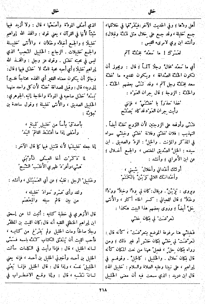 ؛ أَي أَحبه مَحَبَّةً تامَّة لَا خَلَل فِيهَا؛ قَالَ: وَجَائِزٌ أَن يَكُونَ مَعْنَاهُ الْفَقِيرَ أَي اتَّخَذَهُ مُحْتَاجًا فَقِيرًا إِلى رَبِّهِ، قَالَ: وَقِيلَ لِلصَّدَاقَةِ خُلَّة لأَن كُلَّ وَاحِدٍ مِنْهُمَا يَسُدُّ خَلَل صَاحِبِهِ فِي الْمَوَدَّةِ وَالْحَاجَةِ إِليه. الْجَوْهَرِيُّ: الخَلِيل الصَّدِيقُ، والأُنثى خَلِيلة؛ وَقَوْلُ سَاعِدَةَ بْنِ جُؤَيَّة: