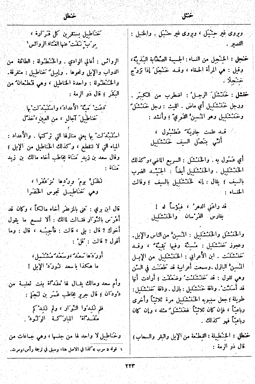 خنشل: خَنْشَلَ الرجلُ: اضْطَرَبَ مِنَ الكِبَر. وَرَجُلٌ خَنْشَلِيل أَي مَاضٍ. اللَّيْثُ: رَجُلٌ خَنْشَلٌ وخَنْشَلِيل وَهُوَ المُسِنُّ القَوِيّ؛ وأَنشد: