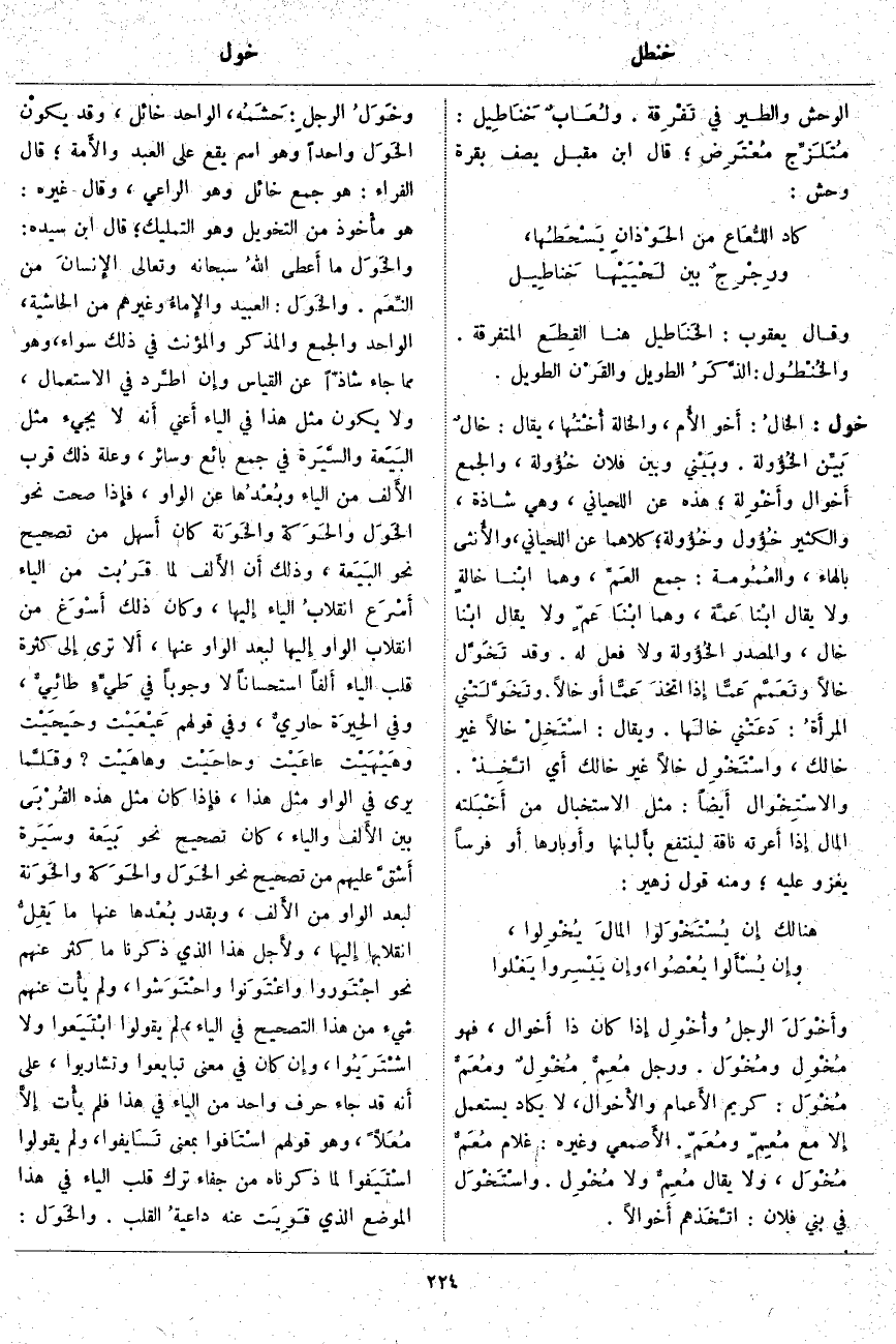 وأَخْوَلَ الرجلُ وأُخْوِلَ إِذا كَانَ ذَا أَخوال، فَهُوَ مُخْوِلٌ ومُخْوَلٌ. وَرَجُلٌ مُعِمٌّ مُخْوِلٌ ومُعَمٌّ مُخْوَلٌ: كَرِيمُ الأَعمام والأَخوال، لَا يَكَادُ يُسْتَعْمَلُ إِلا مَعَ مُعِمٍّ ومُعَمٍّ. الأَصمعي وَغَيْرُهُ: غُلَامٌ مُعَمٌّ مُخْوَل، وَلَا يُقَالُ مُعِمٌّ وَلَا مُخْوِل. واسْتَخْوَلَ فِي بَنِي فُلَانٍ: اتَّخَذهم أَخوالًا. وخَوَلُ الرجلِ: حَشَمُه، الْوَاحِدُ خَائِل، وَقَدْ يَكُونُ الخَوَل وَاحِدًا وَهُوَ اسْمٌ يَقَعُ عَلَى الْعَبْدِ والأَمة؛ قَالَ الْفَرَّاءُ: هُوَ جَمْعُ خَائِل وَهُوَ الرَّاعِي، وَقَالَ غَيْرُهُ: هُوَ مأْخوذ مِنَ التَّخْوِيل وَهُوَ التَّمْلِيكُ؛ قَالَ ابْنُ سِيدَهْ: والخَوَل مَا أَعطى اللهُ سُبْحَانَهُ وَتَعَالَى الإِنسانَ مِنَ النِّعَم. والخَوَل: الْعَبِيدُ والإِماءُ وَغَيْرُهُمْ مِنَ الْحَاشِيَةِ، الْوَاحِدُ وَالْجَمْعُ وَالْمُذَكَّرُ وَالْمُؤَنَّثُ فِي ذَلِكَ سَوَاءٌ، وَهُوَ مِمَّا جَاءَ شَاذًّا عَنِ الْقِيَاسِ وإِن اطَّرد فِي الِاسْتِعْمَالِ، وَلَا يَكُونُ مِثْلُ هَذَا فِي الْيَاءِ أَعني أَنه لَا يَجِيءُ مِثْلُ البَيَعة والسَّيَرة فِي جَمْعِ بَائِعٍ وَسَائِرٍ، وَعِلَّةُ ذَلِكَ قُرْبُ الأَلف مِنَ الْيَاءِ وبُعْدُها عَنِ الْوَاوِ، فإِذا صَحَّتْ نَحْوُ الخَوَل والحَوَكة والخَوَنة كَانَ أَسهل مِنْ تَصْحِيحِ نَحْوِ البَيَعة، وَذَلِكَ أَن الأَلف لَمَّا قَرُبت مِنَ الْيَاءِ أَسْرَع انقلابُ الْيَاءِ إِليها، وَكَانَ ذَلِكَ أَسْوَغ مِنِ انْقِلَابِ الْوَاوِ إِليها لِبُعْدِ الْوَاوِ عَنْهَا، أَلا تَرَى إِلى كَثْرَةِ قَلْبِ الْيَاءِ أَلفاً اسْتِحْسَانًا لا وجوباً في طَيِءٍ طائِيٌّ، وَفِي الحِيرَة حارِيٌّ، وَفِي قَوْلِهِمْ عَيْعَيْت وحَيحَيْت وهَيْهَيْت عاعَيْت وحاحَيْت وهاهَيْت؟ وقَلَّما يُرَى فِي الْوَاوِ مِثْلُ هَذَا، فإِذا كَانَ مِثْلُ هَذِهِ القُرْبَى بَيْنَ الأَلف وَالْيَاءِ، كَانَ تَصْحِيحُ نَحْوِ بَيَعة وسَيَرة أَشقَّ عَلَيْهِمْ مِنْ تَصْحِيحِ نَحْوِ الخَوَل والحَوَكة والخَوَنة لِبُعْدِ الْوَاوِ مِنَ الأَلف، وَبِقَدْرِ بُعْدها عَنْهَا مَا يَقِلُّ انْقِلَابُهَا إِليها، ولأَجل هَذَا الَّذِي ذَكَرْنَا مَا كَثُرَ عَنْهُمْ نَحْوُ اجْتَوروا واعْتَوَنوا واحْتَوَشوا، وَلَمْ يأْت عَنْهُمْ شَيْءٌ مِنْ هَذَا التَّصْحِيحِ فِي الْيَاءِ، لَمْ يَقُولُوا ابْتَيَعوا وَلَا اشْتَرَيُوا، وإِن كَانَ فِي مَعْنَى تَبَايَعُوا وَتَشَارَيُوا، عَلَى أَنه قَدْ جَاءَ حَرْفٌ وَاحِدٌ مِنَ الْيَاءِ فِي هَذَا فَلَمْ يأْت إِلَّا مُعَلًّا، وَهُوَ قَوْلُهُمُ اسْتَافوا بِمَعْنَى تَسَايفوا، وَلَمْ يَقُولُوا اسْتَيَفوا لِمَا ذَكَرْنَاهُ مِنْ جَفَاءِ تَرْكِ قَلْبِ الْيَاءِ فِي هَذَا الْمَوْضِعِ الَّذِي قَوِيَت عَنْهُ داعيةُ الْقَلْبِ. والخَوَل: