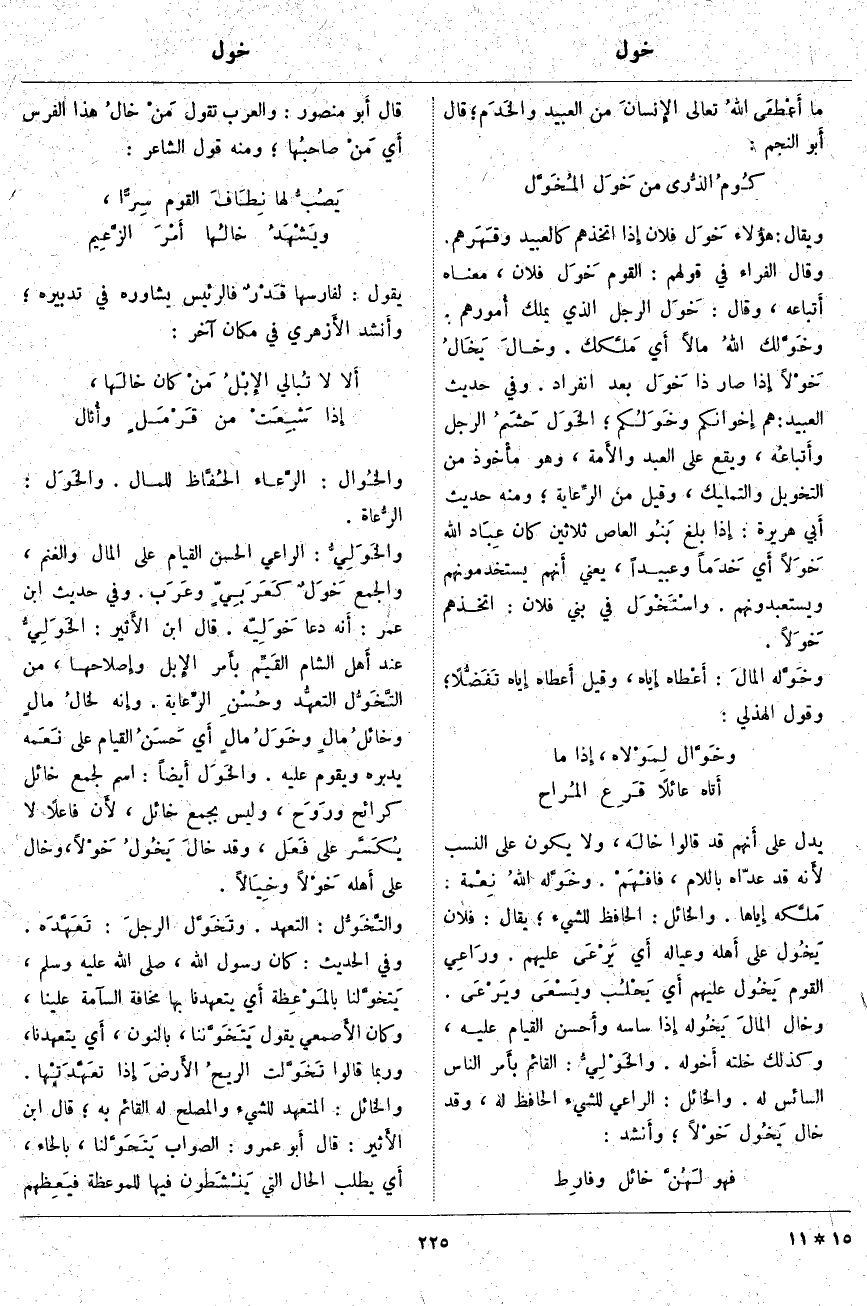 يَدُلُّ عَلَى أَنهم قَدْ قَالُوا خالَه، وَلَا يَكُونُ عَلَى النَّسَبِ لأَنه قَدْ عَدَّاهُ بِاللَّامِ، فافْهَمْ. وخَوَّلَهُ اللهُ نِعْمة: مَلَّكه إِياها. والخَائِل: الْحَافِظُ لِلشَّيْءِ؛ يُقَالُ: فُلَانٌ يَخُولُ عَلَى أَهله وَعِيَالِهِ أَي يَرْعَى عَلَيْهِمْ. ورَاعِي الْقَوْمِ يَخُولُ عَلَيْهِمْ أَي يَحْلُب ويَسْعَى ويَرْعَى. وخَالَ المالَ يَخُولُه إِذا سَاسَهُ وأَحسن الْقِيَامَ عَلَيْهِ، وَكَذَلِكَ خُلْتُهُ أَخُولُهُ. والخَوْلِيُّ: الْقَائِمُ بأَمر النَّاسِ السَّائِسُ لَهُ. والخَائِل: الرَّاعِي لِلشَّيْءِ الْحَافِظُ لَهُ، وَقَدْ خَالَ يَخُولُ خَوْلًا؛ وأَنشد: