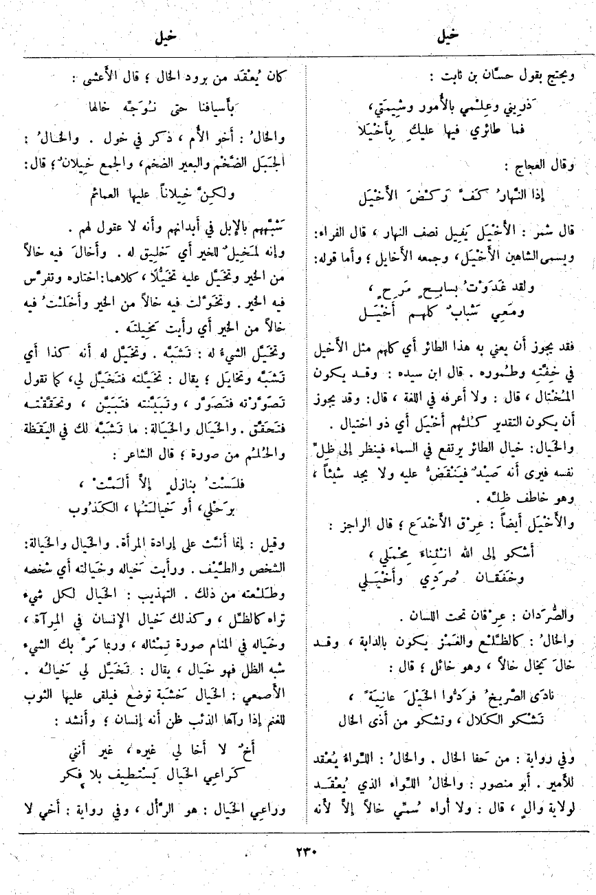 شَبَّههم بالإِبل فِي أَبدانهم وأَنه لَا عُقُولَ لَهُمْ. وإِنه لمَخِيلٌ لِلْخَيْرِ أَي خَلِيق لَهُ. وأَخَالَ فِيهِ خَالًا مِنَ الْخَيْرِ وتَخَيَّلَ عَلَيْهِ تَخَيُّلًا، كِلَاهُمَا: اخْتَارَهُ وتفرَّس فِيهِ الْخَيْرَ. وتَخَوَّلَت فِيهِ خَالًا مِنَ الْخَيْرِ وأَخَلْتُ فِيهِ خَالًا مِنَ الْخَيْرِ أَي رأَيت مَخِيلَتَه. وتَخَيَّلَ الشيءُ لَهُ: تَشَبَّه. وتَخَيَّلَ لَهُ أَنه كَذَا أَي تَشَبَّه وتَخَايَلَ؛ يُقَالُ: تَخَيَّلْته فَتَخَيَّلَ لِي، كَمَا تَقُولُ تَصَوَّرْته فَتَصَوَّر، وتَبَيَّنته فَتَبَيَّن، وتَحَقَّقْته فَتَحَقَّق. والخَيَال والخَيَالة: مَا تَشَبَّه لَكَ فِي اليَقَظة والحُلُم مِنْ صُورَةٍ؛ قَالَ الشَّاعِرُ: