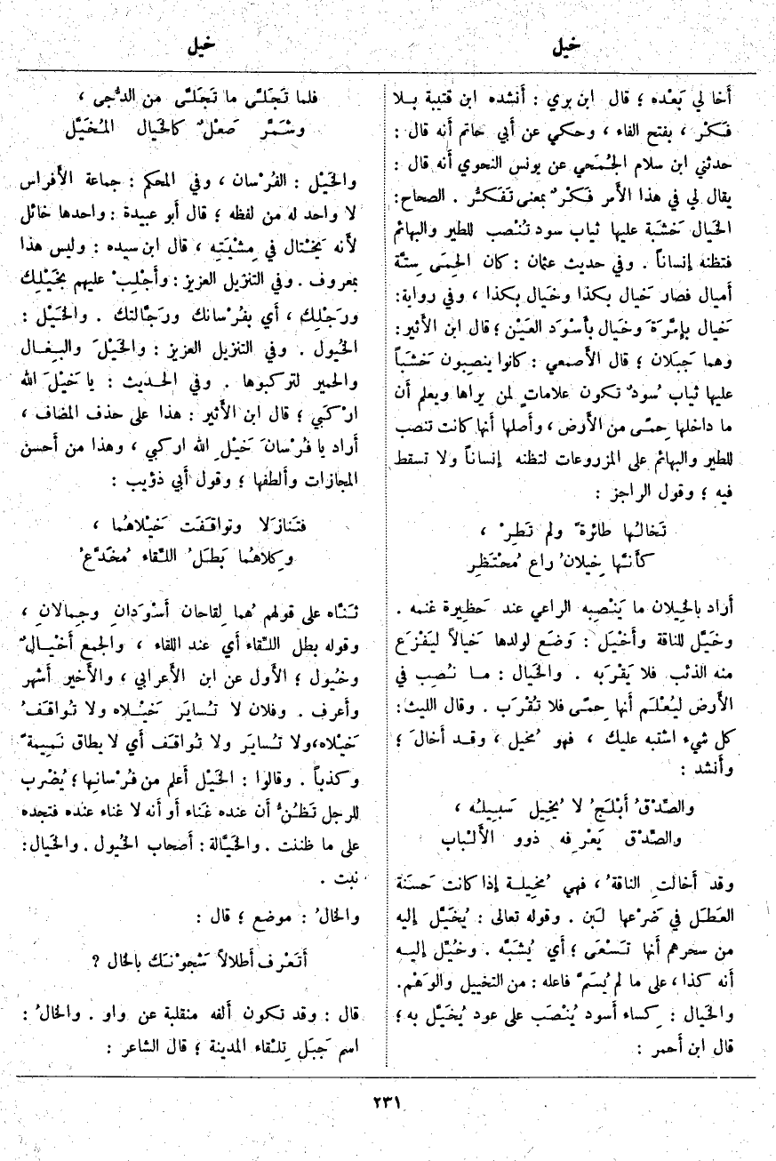 ثَنَّاه عَلَى قَوْلِهِمْ هُما لِقاحان أَسْوَدانِ وجِمالانِ، وَقَوْلُهُ بَطَلُ اللِّقاء أَي عِنْدَ اللِّقَاءِ، وَالْجَمْعُ أَخْيَالٌ وخُيُول؛ الأَول عَنِ ابْنِ الأَعرابي، والأَخير أَشهر وأَعرف. وَفُلَانٌ لَا تُسايَر خَيْلاه وَلَا تُواقَفُ خَيْلاه، وَلَا تُسايَر وَلَا تُواقَف أَي لَا يُطَاقُ نَمِيمةً وَكَذِبًا. وَقَالُوا: الخَيْل أَعلم مِنْ فُرْسانِها؛ يُضْرب لِلرَّجُلِ تَظُنُّ أَن عِنْدَهُ غَناء أَو أَنه لَا غَنَاءَ عِنْدَهُ فَتَجِدُهُ عَلَى مَا ظَنَنْتَ. والخَيَّالة: أَصحاب الخُيول. والخَيَال: نَبْتٌ. والخَالُ: مَوْضِعٌ؛ قَالَ: