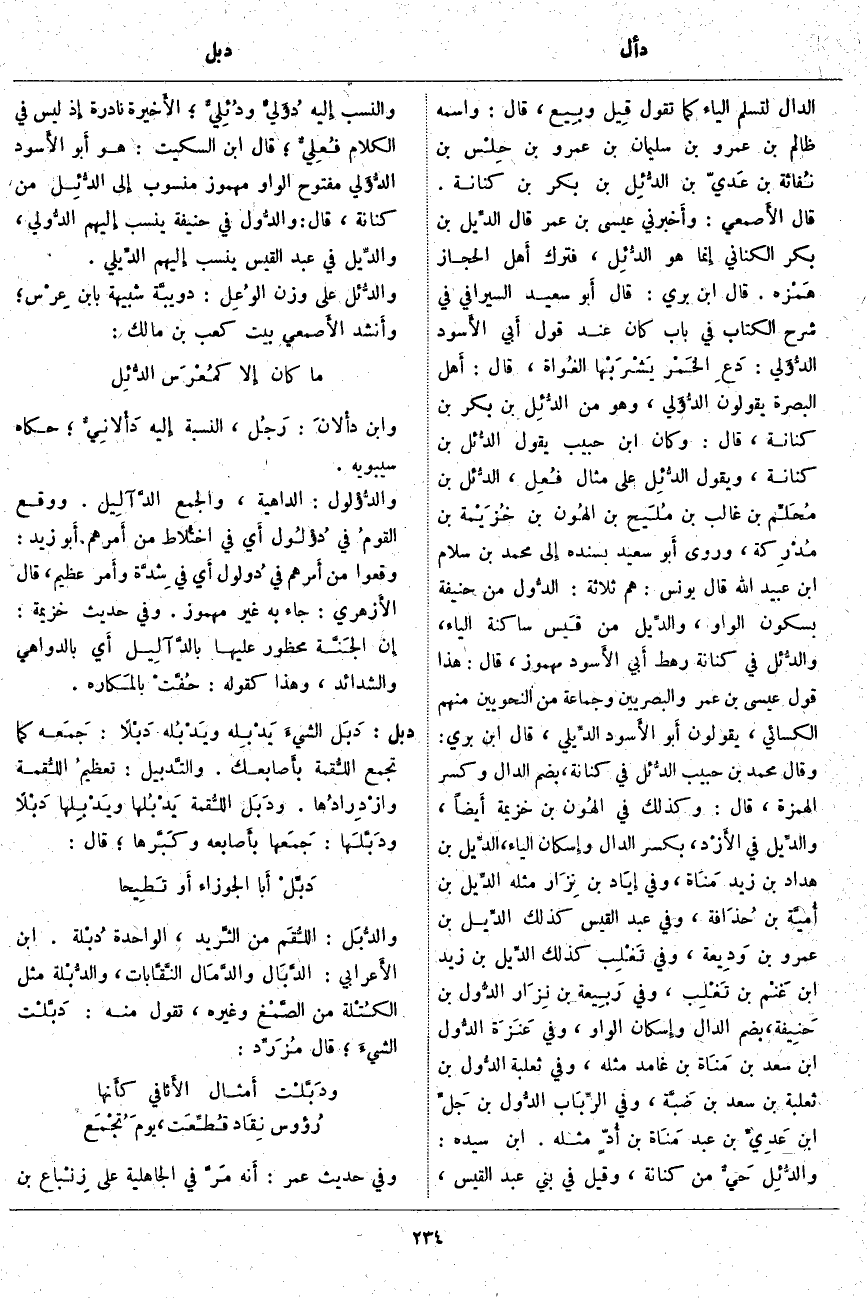 الدَّالُ لِتَسْلَمَ الْيَاءُ كَمَا تَقُولُ قِيل وبِيع، قَالَ: وَاسْمُهُ ظَالِمُ بْنُ عَمْرِو بْنِ سُلَيْمَانَ بْنِ عَمْرِو بْنِ حِلْس بْنِ نُفاثة بْنِ عَديّ بْنِ الدُّئِل بْنِ بَكْرِ بْنِ كِنَانَةَ. قَالَ الأَصمعي: وأَخبرني عِيسَى بْنُ عُمَرَ قَالَ الدِّيل بْنُ بَكْرٍ الْكِنَانِيُّ إِنما هُوَ الدُّئِل، فَتَرَكَ أَهل الْحِجَازِ هَمْزه. قَالَ ابْنُ بَرِّيٍّ: قَالَ أَبو سَعِيدٍ السِّيرَافِيُّ فِي شَرْحِ الْكِتَابِ فِي بَابِ كَانَ عِنْدَ قَوْلُ أَبي الأَسود الدُّؤَلي: دَعِ الخَمْر يَشْرَبْها الغُواة، قَالَ: أَهل الْبَصْرَةِ يَقُولُونَ الدُّؤَلي، وَهُوَ مِنَ الدُّئِل بْنِ بَكْرِ بْنِ كِنَانَةَ، قَالَ: وَكَانَ ابْنُ حَبِيبٍ يَقُولُ الدُّئِل بْنُ كِنَانَةَ، وَيَقُولُ الدُّئِل عَلَى مِثَالِ فُعِل، الدُّئِل بْنُ مُحَلِّم بْنِ غَالِبِ بْنِ مُلَيح بْنِ الهُون بْنُ خُزَيْمة بْنِ مُدْرِكة، وَرَوَى أَبو سَعِيدٍ بِسَنَدِهِ إِلى مُحَمَّدِ بْنِ سَلَامِ بْنِ عُبَيْدِ اللَّهِ قَالَ يُونُسُ: هُمْ ثَلَاثَةٌ: الدُّول مِنْ حَنِيفَةَ بِسُكُونِ الْوَاوِ، والدِّيل مِنْ قَيس سَاكِنَةَ الْيَاءِ، والدُّئِل فِي كِنَانَةَ رَهْطُ أَبي الأَسود مَهْمُوزٌ، قَالَ: هَذَا قَوْلُ عِيسَى بْنِ عُمَرَ وَالْبَصْرِيِّينَ وَجَمَاعَةٍ مِنَ النَّحْوِيِّينَ مِنْهُمُ الْكِسَائِيُّ، يَقُولُونَ أَبو الأَسود الدِّيلي، قَالَ ابْنُ بَرِّيٍّ: وَقَالَ مُحَمَّدُ بْنُ حَبِيبٍ الدُّئِل فِي كِنَانَةَ، بِضَمِّ الدَّالِ وَكَسْرِ الْهَمْزَةِ، قَالَ: وَكَذَلِكَ فِي الهُون بْنِ خُزَيْمَةَ أَيضاً، والدِّيل فِي الأَزْد، بِكَسْرِ الدَّالِ وإِسكان الْيَاءِ، الدِّيل بْنُ هَدَادِ بْنِ زَيْدِ مَنَاة، وَفِي إِيَاد بْنِ نِزَار مِثْلُهُ الدِّيل بْنُ أُميَّة بْنِ حُذَافة، وَفِي عَبْدِ الْقَيْسِ كَذَلِكَ الدِّيل بْنُ عَمْرِو بْنِ وَدِيعة، وَفِي تَغْلب كَذَلِكَ الدِّيل بْنُ زَيْدِ بْنِ غَنْم بْنِ تَغْلِب، وَفِي رَبِيعة بْنِ نِزَار الدُّول بْنُ حَنِيفة، بِضَمِّ الدَّالِ وإِسكان الْوَاوِ، وَفِي عَنَزَة الدُّول بْنُ سَعْدِ بْنِ مَنَاة بْنِ غَامِدٍ مِثْلُهُ، وَفِي ثَعْلَبَةَ الدُّول بْنُ ثَعْلَبَةَ بْنِ سَعْدِ بْنِ ضَبَّة، وَفِي الرِّبَاب الدُّول بْنُ جَلِّ بْنِ عَدِيِّ بْنِ عَبْدِ مَنَاة بْنِ أُدٍّ مِثْلُهُ. ابْنُ سِيدَهْ: والدُّئِل حَيٌّ مِنْ كِنَانَةَ، وَقِيلَ فِي بَنِي عَبْدِ الْقَيْسِ، وَالنَّسَبُ إِليه دُؤَليٌّ ودُئِليٌّ؛ الأَخيرة نَادِرَةٌ إِذ لَيْسَ فِي الْكَلَامِ فُعِليٌّ؛ قَالَ ابْنُ السِّكِّيتِ: هُوَ أَبو الأَسود الدُّؤَلي مَفْتُوحُ الْوَاوِ مَهْمُوزٌ مَنْسُوبٌ إِلى الدُّئِل مِنْ كِنَانَةَ، قَالَ: والدُّول فِي حنيفة ينسب إِليهم الدُّولي، والدِّيل فِي عَبْدِ الْقَيْسِ يُنْسَبُ إِليهم الدِّيلي. والدُّئِل عَلَى وَزْنِ الوُعِل: دويبَّة شَبِيهَةٌ بِابْنِ عِرْس؛ وأَنشد الأَصمعي بَيْتَ كَعْبِ بْنِ مَالِكٍ:
