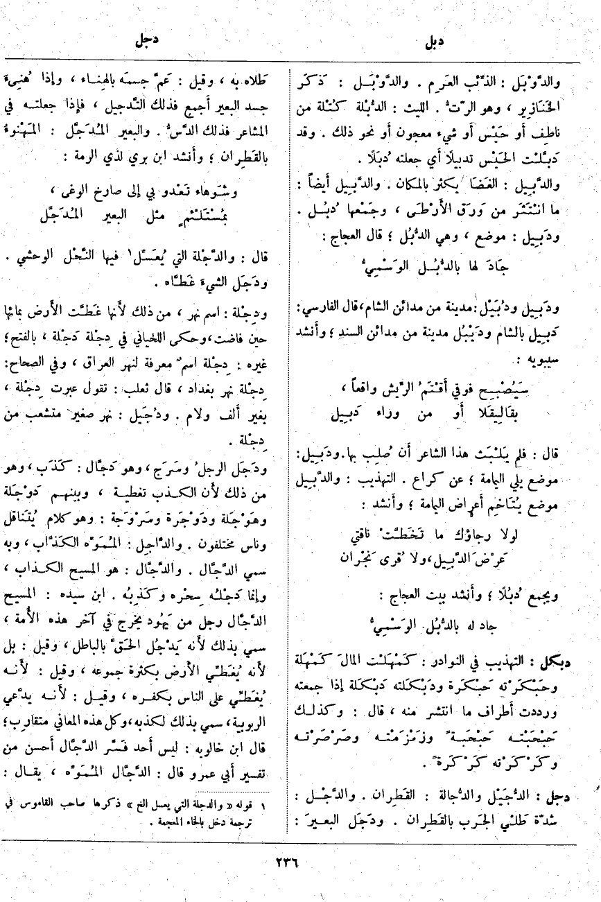 دجل: الدُّجَيْل والدُّجَالة؛ القَطِران. والدَّجْل: شِدَّةُ طَلْي الجَرْب بالقَطِران. ودَجَلَ البعيرَ: طَلاه بِهِ، وَقِيلَ: عَمَّ جسمَه بالهِناء، وإِذا هُنِئَ جَسَدُ الْبَعِيرُ أَجمع فَذَلِكَ التَّدْجِيل، فإِذا جَعَلْتَهُ فِي الْمَشَاعِرِ فَذَلِكَ الدَّسُّ. وَالْبَعِيرُ المُدَجَّل: المَهْنوءُ بالقَطِران؛ وأَنشد، ابْنُ بَرِّيٍّ لِذِي الرُّمَّةِ:
