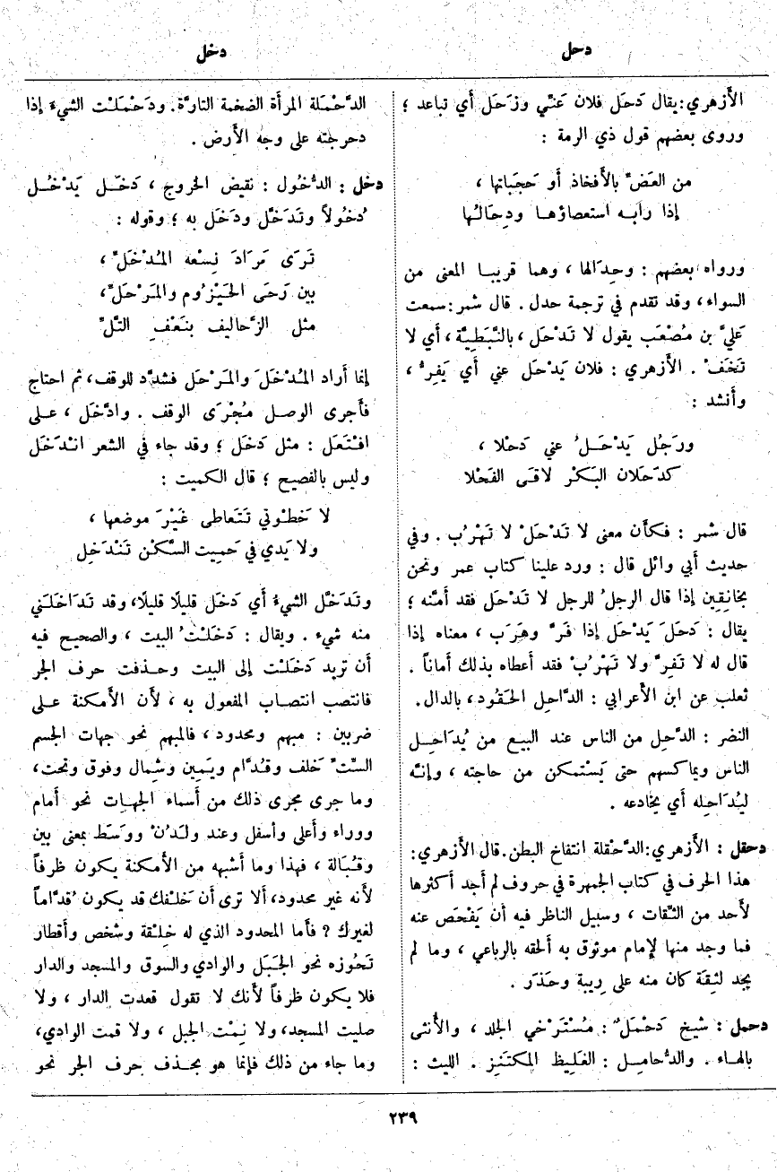 وَرَوَاهُ بَعْضُهُمْ: وحِدَالها، وَهُمَا قَرِيبَا الْمَعْنَى مِنَ السَّوَاءِ، وَقَدْ تَقَدَّمَ فِي تَرْجَمَةٍ حَدَلَ. قَالَ شَمِرٌ: سَمِعْتُ عَليَّ بْنَ مُصْعَب يَقُولُ لَا تَدْحَلْ، بالنَّبَطِيَّة، أَي لَا تَخَفْ. الأَزهري: فُلَانٌ يَدْحَلُ عَنِّي أَي يَفِرُّ، وأَنشد: