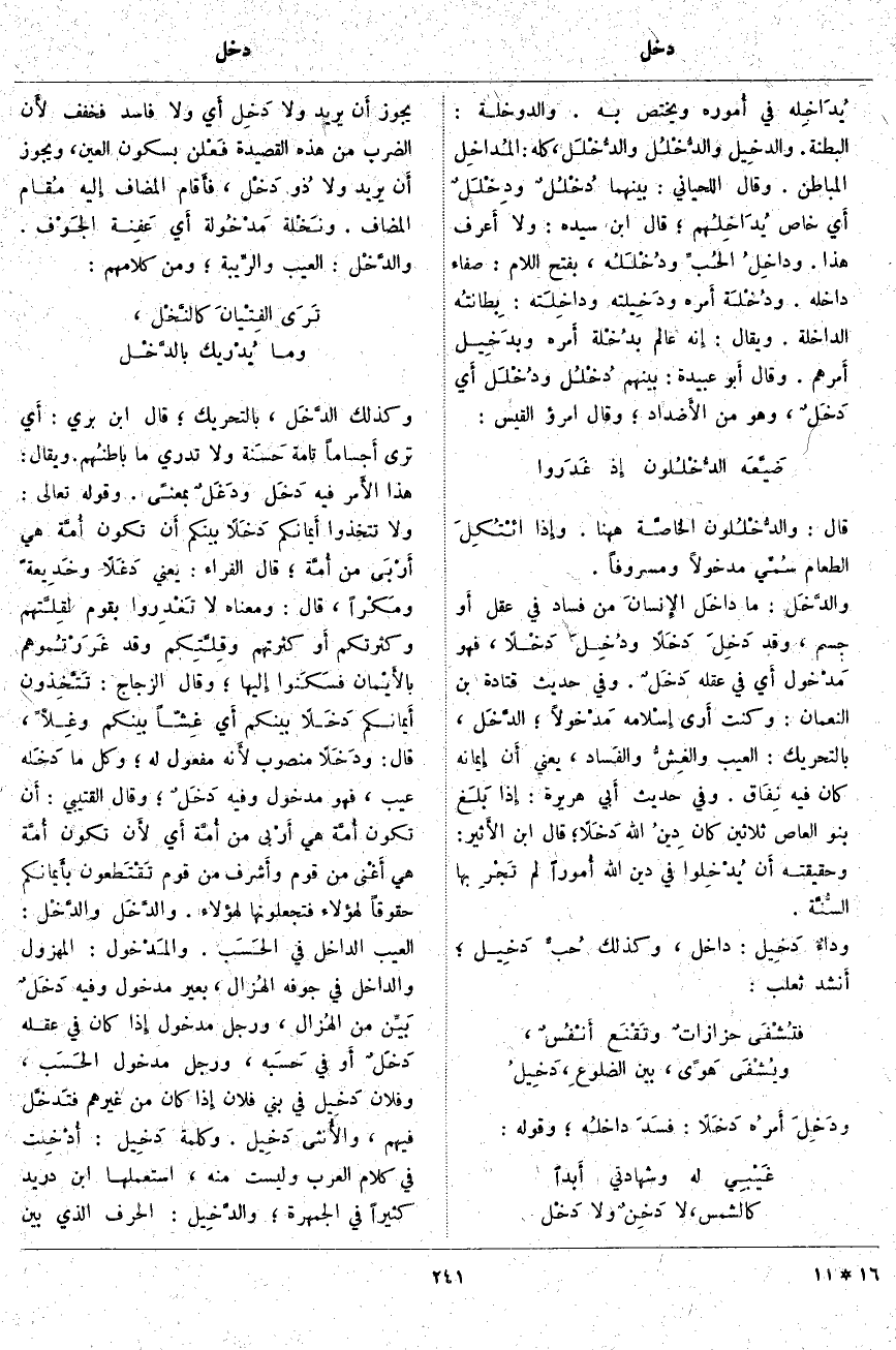 ؛ قَالَ الْفَرَّاءُ: يَعْنِي دَغَلًا وخَدِيعةً ومَكْراً، قَالَ: وَمَعْنَاهُ لَا تَغْدِروا بِقَوْمٍ لقِلَّتهم وَكَثْرَتِكُمْ أَو كَثْرَتِهِمْ وقِلَّتِكم وَقَدْ غَرَرْتُموهم بالأَيْمان فسَكَنوا إِليها؛ وَقَالَ الزَّجَّاجُ: تَتَّخِذون أَيمانكم دَخَلًا بَيْنَكُمْ أَي غِشّاً بَيْنَكُمْ وغِلًّا، قَالَ: ودَخَلًا مَنْصُوبٌ لأَنه مَفْعُولٌ لَهُ؛ وَكُلُّ مَا دَخَله عَيْبٌ، فَهُوَ مَدْخُول وَفِيهِ دَخَلٌ؛ وَقَالَ الْقُتَيْبِيُّ: أَنْ تَكُونَ أُمَّةٌ هِيَ أَرْبى مِنْ أُمَّةٍ أَي لأَن تَكُونَ أُمَّة هِيَ أَغْنى مِنْ قَوْمٍ وأَشرف مِنْ قَوْمٍ تَقْتَطعون بأَيمانكم حُقُوقًا لِهَؤُلَاءِ فَتَجْعَلُونَهَا لِهَؤُلَاءِ. والدَّخَل والدَّخْل: الْعَيْبُ الدَّاخِلُ فِي الحَسَب. والمَدْخُول: الْمَهْزُولُ والدَّاخِل فِي جَوْفِهِ الهُزال، بَعِيرٌ مَدخول وَفِيهِ دَخَلٌ بَيِّن مِنَ الهُزال، وَرَجُلٌ مَدْخُولٌ إِذا كَانَ فِي عَقْلِهِ دَخَلٌ أَو فِي حَسَبه، وَرَجُلٌ مَدْخُولُ الحَسَب، وَفُلَانٌ دَخِيل فِي بَنِي فُلَانٍ إِذا كَانَ مِنْ غَيْرِهِمْ فتَدخَّل فِيهِمْ، والأُنثى دَخِيل. وَكَلِمَةُ دَخِيل: أُدْخِلت فِي كَلَامِ الْعَرَبِ وَلَيْسَتْ مِنْهُ، اسْتَعْمَلَهَا ابْنُ دُرَيْدٍ كَثِيرًا فِي الْجَمْهَرَةِ؛ والدَّخِيل: الْحَرْفُ الَّذِي بَيْنَ