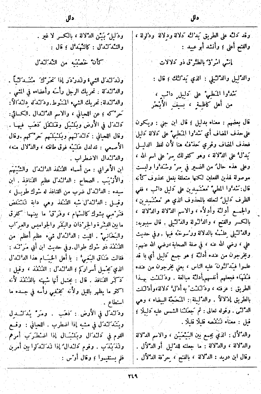 قَالَ بَعْضُهُمْ: مَعْنَاهُ بِدَلِيلٍ؛ قَالَ ابْنُ جِنِّيٍّ: وَيَكُونُ عَلَى حَذْفِ الْمُضَافِ أَي شَدُّوا المَطِيَّ عَلَى دَلالة دَليل فَحَذَفَ الْمُضَافَ وقوِي حَذْفُه هُنَا لأَن لَفْظَ الدَّلِيل يَدُلُّ عَلَى الدَّلالة، وَهُوَ كَقَوْلِكَ سِرْ عَلَى اسْمِ اللَّهِ، وَعَلَى هَذِهِ حالٌ مِنَ الضَّمِيرِ فِي سِرْ وشَدُّوا وَلَيْسَتْ مَوْصُولَةً لِهَذَيْنِ الْفِعْلَيْنِ لَكِنَّهَا مُتَعَلِّقَةٌ بِفِعْلٍ مَحْذُوفٍ كأَنه قَالَ: شَدُّوا المطيَّ مُعْتَمِدِين عَلَى دَليل دَائِبٍ، فَفِي الظَّرْفِ دَليلٌ لِتَعَلُّقِهِ بِالْمَحْذُوفِ الَّذِي هُوَ مُعْتَمِدِين، وَالْجَمْعُ أَدِلَّة وأَدِلَّاء، وَالِاسْمُ الدِّلالة والدَّلالة، بِالْكَسْرِ وَالْفَتْحِ، والدُّلُولة والدِّلِّيلى. قَالَ سِيبَوَيْهِ: والدِّلِّيلى عِلْمُه بِالدَّلَالَةِ ورُسوخُه فِيهَا. وَفِي حَدِيثِ