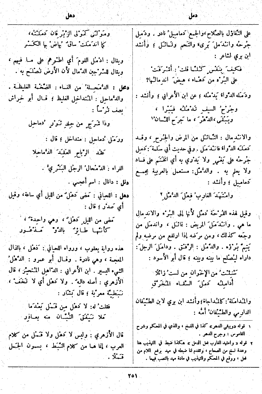 دمحل: الدُّمَحِلةُ مِنَ النِّسَاءِ: الضَّخْمة الْغَلِيظَةُ. والدُّماحِل: المُتداخِل الْغَلِيظُ؛ قَالَ أَبو خِراش يَصِفُ تُرْساً: