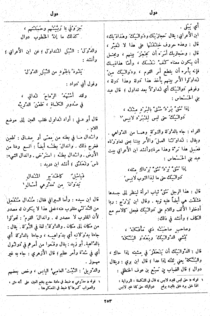 . الْفَرَّاءُ: جَاءَ بالدُّوَلة والتوَلةِ وَهُمَا مِنَ الدَّواهي. وَيُقَالُ: تَداوَلْنا العملَ والأَمر بَيْنَنَا بِمَعْنَى تعاوَرْناه فعَمِل هَذَا مَرَّة وَهَذَا مَرَّةً؛ وأَنشد ابْنُ الأَعرابي بَيْتَ عَبْدِ بَنِي الحَسْحاس:
