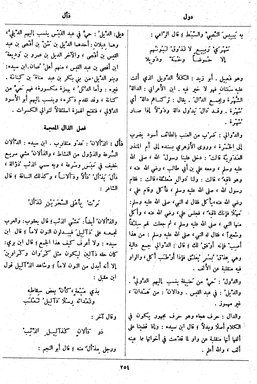 ؛ قَالَ: الدَّوالي جَمْعُ دَالِيَةٍ وَهِيَ عِذْقُ بُسْرٍ يُعلَّق فإِذا أَرْطَب أُكل، وَالْوَاوُ فِيهِ مُنْقَلِبَةٌ عَنِ الأَلف. والدُّولُ: حَيٌّ مِنْ حَنِيفة يُنْسَبُ إِليهم الدُّوليُّ. والدِّيلُ: في عبد الْقَيْسِ. ودَالانُ: مِنْ هَمْدانَ، غَيْرُ مَهْمُوزٍ. والدَّال: حَرْفُ هِجَاءٍ وَهُوَ حَرْفٌ مَجْهُورٌ يَكُونُ فِي الْكَلَامِ أَصلًا وَبَدَلًا؛ قَالَ ابْنُ سِيدَهْ: وإِنما قَضَيْنَا عَلَى أَلفها أَنها مُنْقَلِبَةٌ عَنْ وَاوٍ لَمَّا قُدِّمَتْ فِي أَخواتها مِمَّا عَيْنُهُ أَلف، وَاللَّهُ أَعلم.
