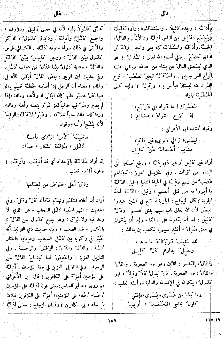 والذِّلُّ، بِالْكَسْرِ: اللِّين وَهُوَ ضِدُّ الصُّعُوبَةِ. والذُّلُّ والذِّلُّ: ضِدُّ الصُّعُوبَةِ. ذَلَّ يَذِلُّ ذُلًّا وذِلًّا، فَهُوَ ذَلُولٌ، يَكُونُ فِي الإِنسان وَالدَّابَّةِ؛ وأَنشد ثَعْلَبٌ: