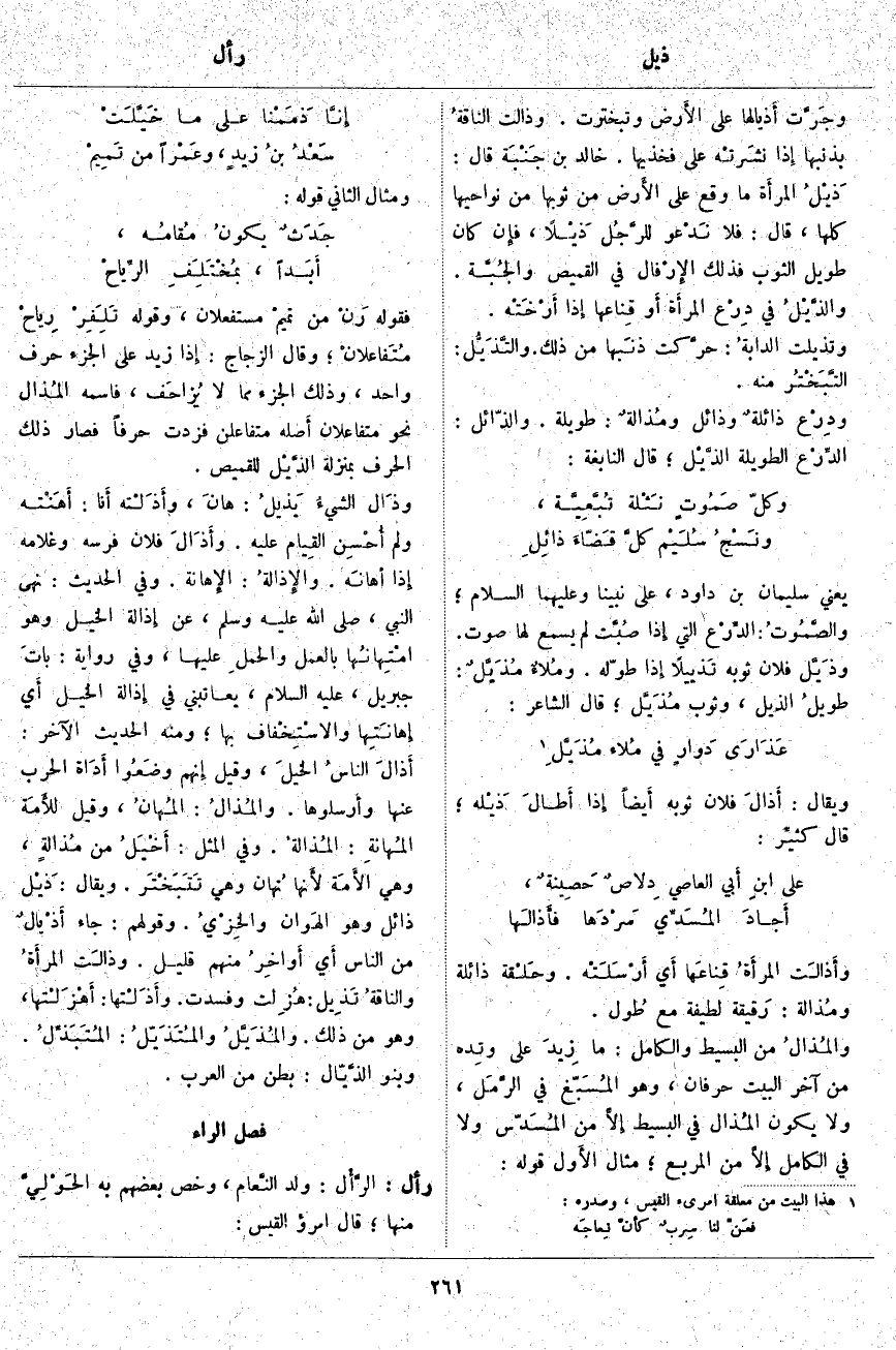 فَقَوْلُهُ رَنْ مِنْ تميمْ مُسْتَفْعِلَانِ، وَقَوْلُهُ تَلِفِرْ [تَلَفِرْ] رِياحْ مُتَفاعلان؛ وَقَالَ الزَّجَّاجُ: إِذا زِيدَ عَلَى الْجُزْءِ حَرْفٌ وَاحِدٌ، وَذَلِكَ الْجُزْءُ مِمَّا لَا يُزاحَف، فَاسْمُهُ المُذال نَحْوُ مُتَفَاعِلَانِ أَصله مُتَفَاعِلُنْ فَزِدْتَ حَرْفًا فَصَارَ ذَلِكَ الْحَرْفُ بِمَنْزِلَةِ الذَّيْل لِلْقَمِيصِ. وذَال الشيءُ يَذِيلُ: هانَ، وأَذَلْتُه أَنا: أَهَنْته وَلَمْ أُحْسِن القِيام عَلَيْهِ. وأَذَالَ فُلَانٌ فَرَسَهُ وَغُلَامَهُ إِذا أَهانَه. والإَذالَةُ: الإِهانة. وَفِي الْحَدِيثِ