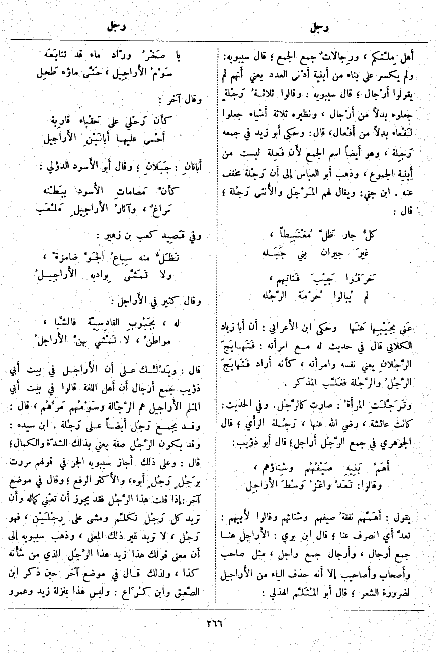 قَالَ: ويَدُلُّك عَلَى أَن الأَراجل فِي بَيْتِ أَبي ذُؤَيْبٍ جَمْعُ أَرْجَال أَن أَهل اللُّغَةِ قَالُوا فِي بَيْتِ أَبي الْمُثَلَّمِ الأَرَاجِيل هُمُ الرَّجَّالَة وسَوْمُهم مَرُّهُم، قَالَ: وَقَدْ يُجْمَعُ رَجُل أَيضاً عَلَى رَجْلة. ابْنُ سِيدَهْ: وَقَدْ يَكُونُ الرَّجُل صِفَةً يَعْنِي بِذَلِكَ الشِّدَّةَ وَالْكَمَالَ؛ قَالَ: وَعَلَى ذَلِكَ أَجاز سِيبَوَيْهِ الْجَرَّ فِي قَوْلِهِمْ مَرَرْتُ برَجُلٍ رَجُلٍ أَبوه، والأَكثر الرَّفْعُ؛ وَقَالَ فِي مَوْضِعٍ آخَرَ: إِذا قُلْتَ هَذَا الرَّجُل فَقَدْ يَجُوزُ أَن تعْني كَمَالَهُ وأَن تُرِيدَ كُلَّ رَجُل تكلَّم وَمَشَى عَلَى رِجْلَيْن، فَهُوَ رَجُل، لَا تُرِيدُ غَيْرَ ذَلِكَ الْمَعْنَى، وَذَهَبَ سِيبَوَيْهِ إِلى أَن مَعْنَى قَوْلِكَ هَذَا زِيدٌ هَذَا الرَّجُل الَّذِي مِنْ شأْنه كَذَا، وَلِذَلِكَ قَالَ فِي مَوْضِعٍ آخَرَ حِينَ ذَكَرَ ابْنَ الصَّعِق وَابْنَ كُرَاع: وَلَيْسَ هَذَا بِمَنْزِلَةِ زَيْدٍ وَعَمْرٍو