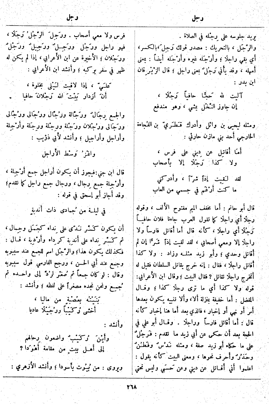 وَالْجَمْعُ رِجَالٌ ورَجَّالَة ورُجَّال ورُجَالَى ورُجَّالى ورَجَالى ورُجْلان ورَجْلة ورِجْلة ورِجَلة وأَرْجِلة وأَرَاجِل وأَرَاجِيل؛ وأَنشد لأَبي ذُؤَيْبٍ: