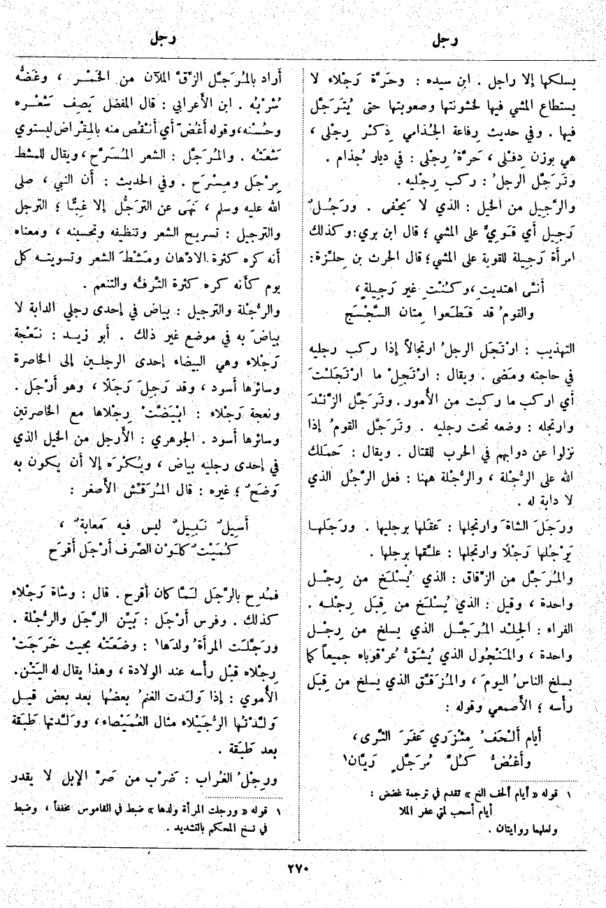 ؛ التَّرَجُّل والتَّرْجِيل: تَسْرِيحُ الشَّعْرِ وَتَنْظِيفُهُ وَتَحْسِينُهُ، وَمَعْنَاهُ أَنه كَرِهَ كَثْرَةَ الادِّهان ومَشْطَ الشَّعْرِ وَتَسْوِيَتَهُ كُلَّ يَوْمٍ كأَنه كَرِهَ كَثْرَةَ التَّرفُّه وَالتَّنَعُّمِ. والرُّجْلة والتَّرْجِيل: بَيَاضٌ فِي إِحدى رِجْلَيِ الدَّابَّةِ لَا بياضَ بِهِ فِي مَوْضِعٍ غَيْرِ ذَلِكَ. أَبو زَيْدٍ: نَعْجة رَجْلاء وَهِيَ الْبَيْضَاءُ إِحدى الرِّجْلَيْنِ إِلى الْخَاصِرَةِ وَسَائِرُهَا أَسود، وَقَدْ رَجِلَ رَجَلًا، وَهُوَ أَرْجَل. وَنَعْجَةٌ رَجْلاء: ابْيَضَّتْ رِجْلاها مَعَ الْخَاصِرَتَيْنِ وَسَائِرُهَا أَسود. الْجَوْهَرِيُّ: الأَرْجَل مِنَ الْخَيْلِ الَّذِي فِي إِحدى رِجْلَيْهِ بَيَاضٌ، ويُكْرَه إِلا أَن يَكُونَ بِهِ وَضَحٌ؛ غَيْرُهُ: قَالَ المُرَقِّش الأَصغر: