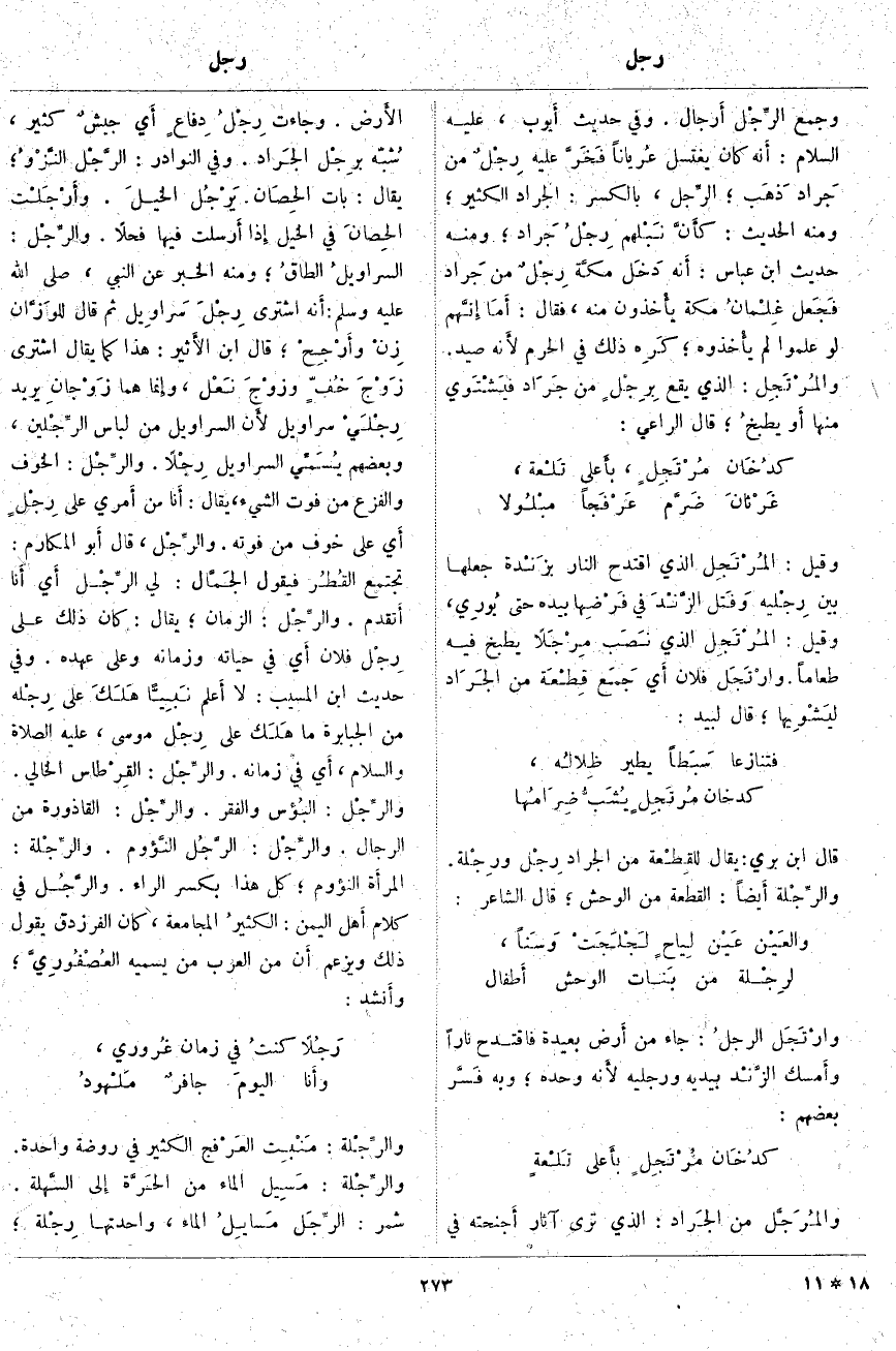 والمُرَجَّل مِنَ الجَراد: الَّذِي تَرَى آثَارَ أَجنحته فِي الأَرض. وَجَاءَتْ رِجْلُ دِفاعٍ أَي جيشٌ كَثِيرٌ، شُبّه برِجْل الجَراد. وَفِي النَّوَادِرِ: الرَّجْل النَّزْوُ؛ يُقَالُ: بَاتَ الحِصَان يَرْجُلُ الخيلَ. وأَرْجَلْت الحِصانَ فِي الْخَيْلِ إِذا أَرسلت فِيهَا فَحْلًا. والرِّجْل: السراويلُ الطاقُ؛ وَمِنْهُ الْخَبَرُ
