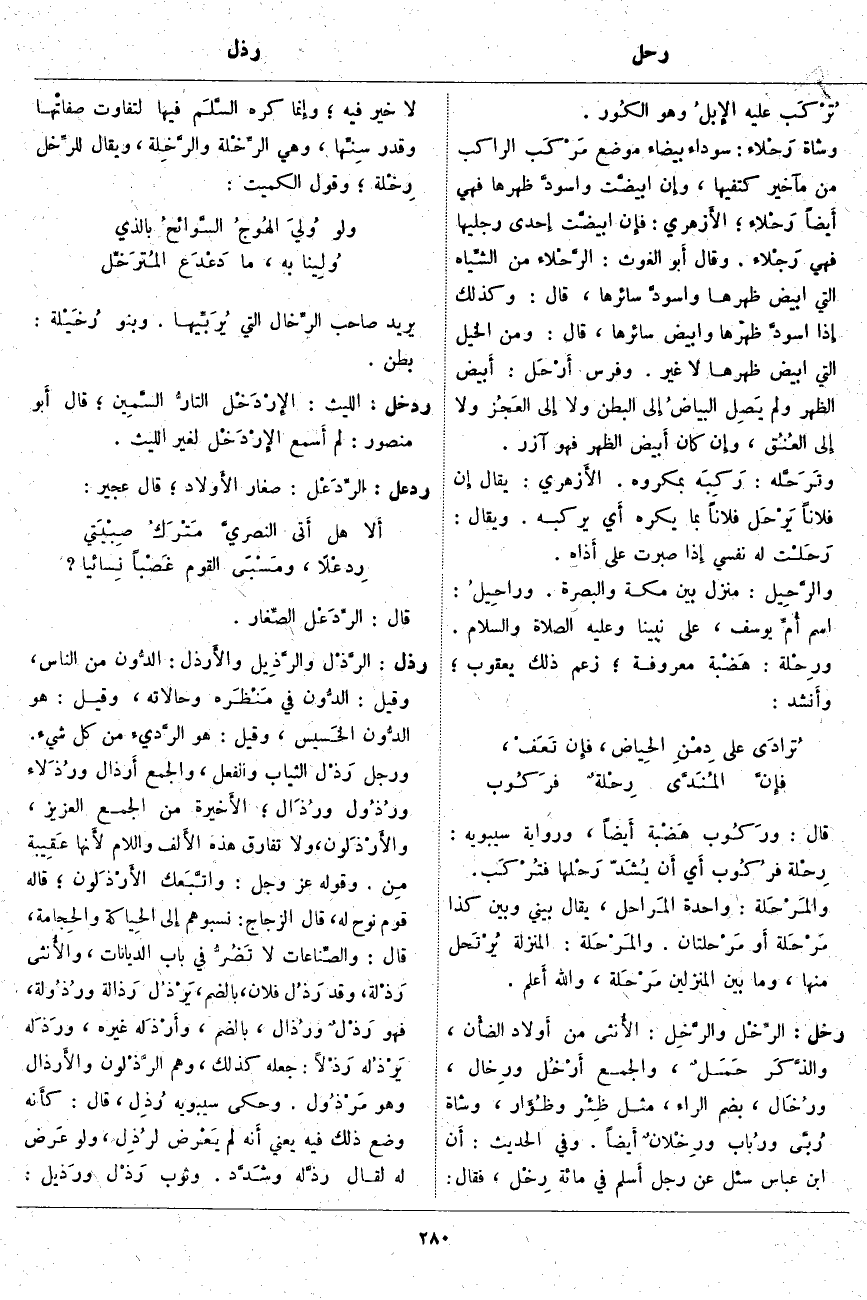 رذل: الرَّذْل والرَّذِيل والأَرذَل: الدُّون مِنَ النَّاسِ، وَقِيلَ: الدُّون فِي مَنْظَره وَحَالَاتِهِ، وَقِيلَ: هُوَ الدُّون الخَسيس، وَقِيلَ: هُوَ الرَّديء مِنْ كُلِّ شَيْءٍ. وَرَجُلٌ رَذْل الثِّيَابِ وَالْفِعْلِ، وَالْجَمْعُ أَرْذَال ورُذَلاء ورُذُول ورُذَال؛ الأَخيرة مِنَ الْجَمْعِ الْعَزِيزِ، والأَرْذَلون، وَلَا تُفَارِقُ هَذِهِ الأَلف وَاللَّامُ لأَنها عَقِيبة مِن. وَقَوْلُهُ عَزَّ وَجَلَّ: وَاتَّبَعَكَ الْأَرْذَلُونَ