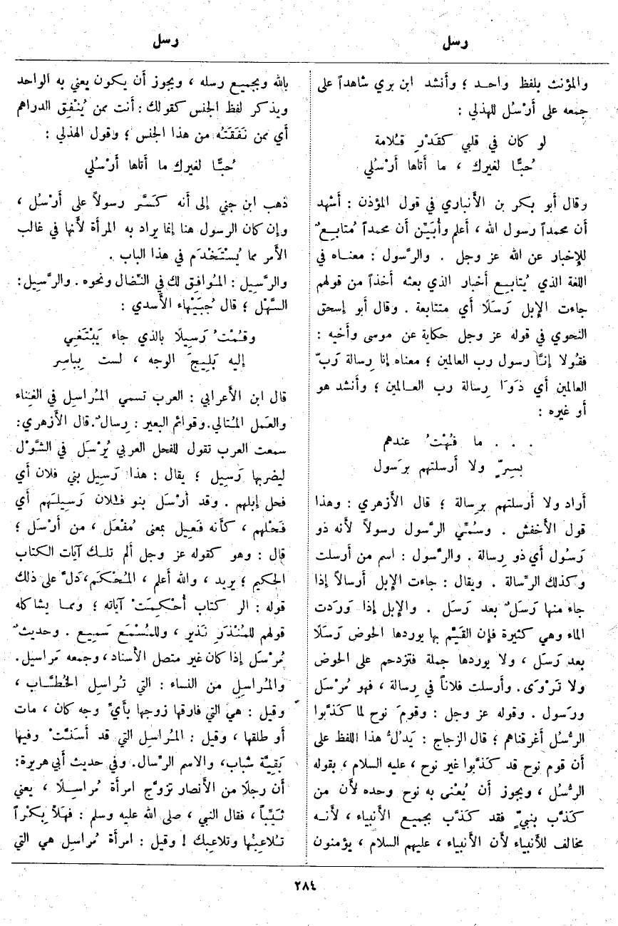 أَراد وَلَا أَرسلتهم برِسالة؛ قَالَ الأَزهري: وَهَذَا قَوْلُ الأَخفش. وسُمِّي الرَّسول رَسُولًا لأَنه ذُو رَسُول أَي ذُو رِسالة. والرَّسول: اسْمٌ مِنْ أَرْسَلْتُ وَكَذَلِكَ الرِّسَالة. وَيُقَالُ: جَاءَتِ الإِبل أَرْسَالًا إِذا جَاءَ مِنْهَا رَسَلٌ بَعْدَ رَسَل. والإِبل إِذا وَرَدت الْمَاءَ وَهِيَ كَثِيرَةٌ فإِن القَيِّم بِهَا يُورِدُهَا الْحَوْضَ رَسَلًا بَعْدَ رَسَل، وَلَا يُورِدُهَا جُمْلَةً فَتَزْدَحِمُ عَلَى الْحَوْضِ وَلَا تَرْوَى. وأَرْسَلْت فُلَانًا فِي رِسالة، فَهُوَ مُرْسَل ورَسُول. وَقَوْلُهُ عَزَّ وَجَلَّ: وَقَوْمَ نُوحٍ لَمَّا كَذَّبُوا الرُّسُلَ أَغْرَقْناهُمْ