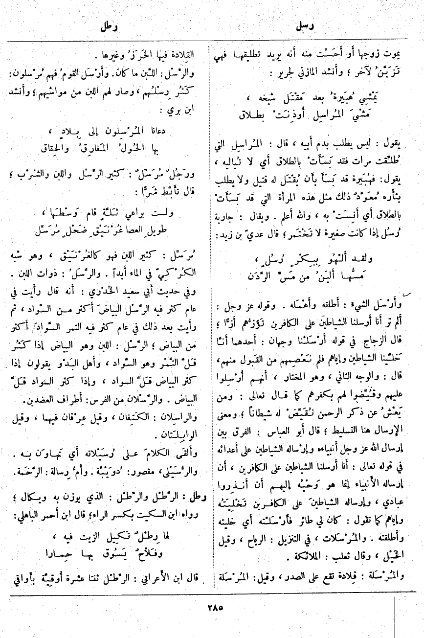 ؛ الرِّسْل: اللَّبَنُ وَهُوَ الْبَيَاضُ إِذا كَثُر قَلَّ التَّمْر وَهُوَ السَّواد، وأَهل البَدْو يَقُولُونَ إِذا كَثُرَ الْبَيَاضُ قَلَّ السَّوَادُ، وإِذا كَثُرَ السَّوَادُ قَلَّ الْبَيَاضُ. والرِّسْلان مِنَ الْفَرَسِ: أَطراف الْعَضُدَيْنِ. والرَّاسِلان: الكَتِفان، وَقِيلَ عِرْقان فِيهِمَا، وَقِيلَ الوابِلَتان. وأَلقَى الكلامَ عَلَى رُسَيْلاته أَي تَهاوَن بِهِ. والرُّسَيْلى، مَقْصُورٌ: دُوَيْبَّة. وأُمُّ رِسَالة: الرَّخَمة.