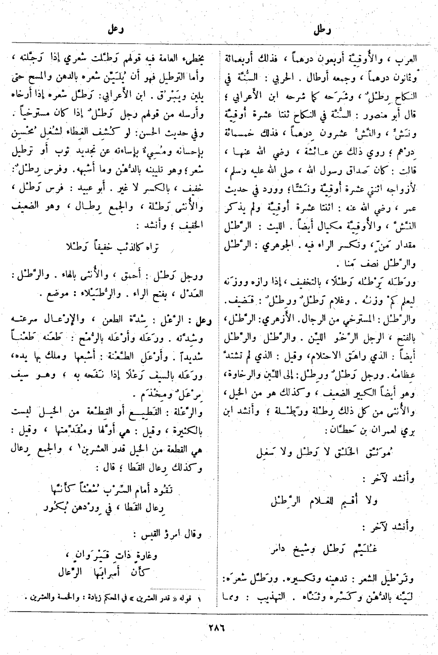 وَلَمْ يَذْكُرِ النَّشَّ، والأُوقِيَّة مِكْيَالٌ أَيضاً. اللَّيْثُ: الرَّطْل مِقْدَارُ مَنٍّ، وَتُكْسَرُ الرَّاءُ فِيهِ. الْجَوْهَرِيُّ: الرَّطْل والرِّطْل نِصْفُ مَنا. ورَطَلَه يَرْطُلُهُ رَطْلًا، بِالتَّخْفِيفِ، إِذا رَازَهُ ووزَنه لِيَعْلَمَ كمْ وزنُه. وَغُلَامٌ رَطْلٌ ورِطْلٌ: قَضيف. والرِّطْل: الْمُسْتَرْخِي مِنَ الرِّجَالِ. الأَزهري: الرَّطْل، بِالْفَتْحِ، الرَّجُلُ الرِّخْو الليِّن. والرَّطْل والرِّطْل أَيضاً: الَّذِي راهَق الِاحْتِلَامَ، وَقِيلَ الَّذِي لَمْ تشتدَّ عِظامُه. وَرَجُلٌ رَطْلٌ ورِطْل: إِلى اللِّين وَالرَّخَاوَةِ، وَهُوَ أَيضاً الْكَبِيرُ الضَّعِيفُ، وَكَذَلِكَ هُوَ مِنَ الْخَيْلِ، والأُنثى مِنْ كُلِّ ذَلِكَ رِطْلَة ورَطْلَة؛ وأَنشد ابْنُ بَرِّيٍّ لِعُمْرَانَ بْنِ حَطَّان: