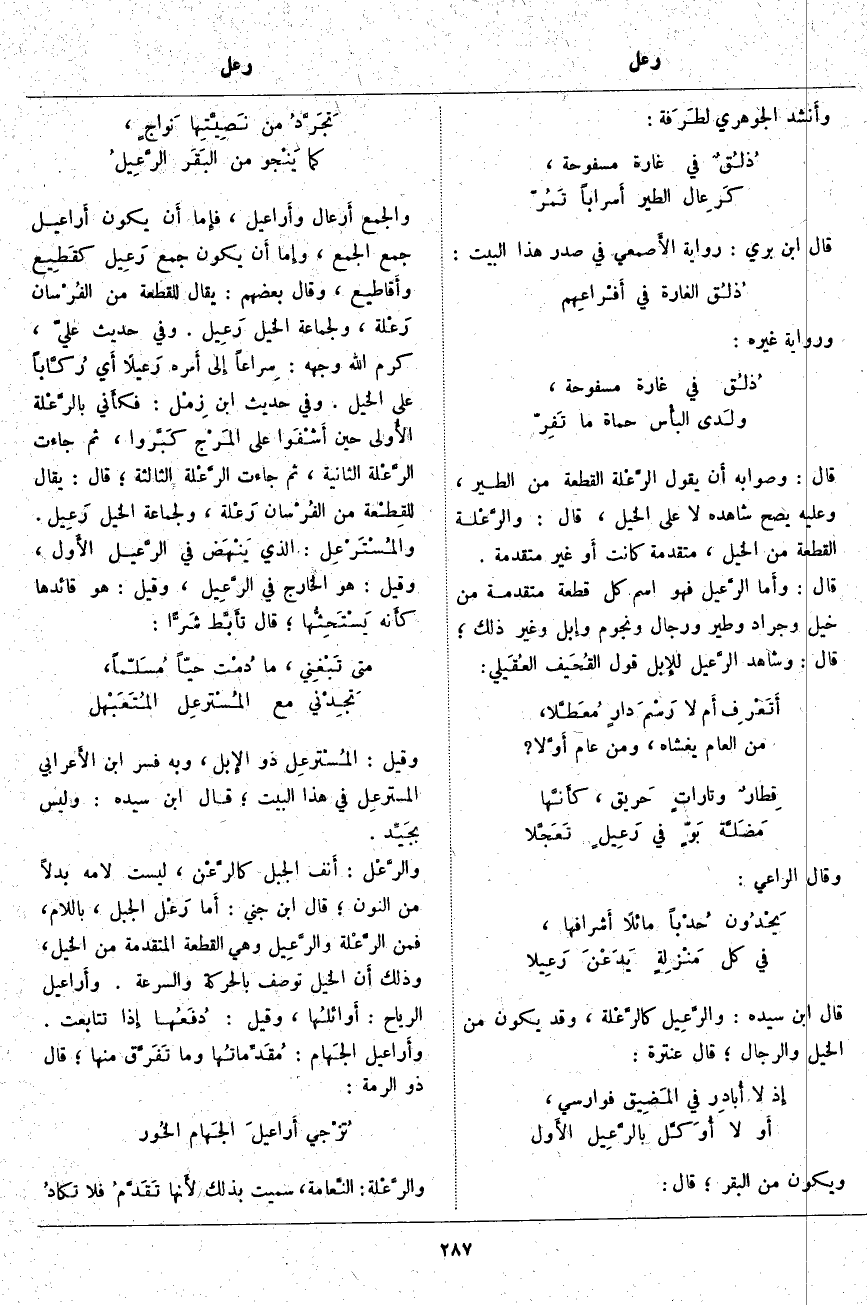 قَالَ: وَصَوَابُهُ أَن يَقُولَ الرَّعْلة الْقِطْعَةُ مِنَ الطَّيْرِ، وَعَلَيْهِ يَصِحُّ شَاهِدُهُ لَا عَلَى الْخَيْلِ، قَالَ: والرَّعْلَة الْقِطْعَةُ مِنَ الْخَيْلِ، مُتَقَدِّمَةٌ كَانَتْ أَو غَيْرُ مُتَقَدِّمَةٍ. قَالَ: وأَما الرَّعِيل فَهُوَ اسْمُ كُلِّ قِطْعَةٍ مُتَقَدِّمَةٍ مِنْ خَيْلٍ وَجَرَادٍ وَطَيْرٍ وَرِجَالٍ وَنُجُومٍ وَإِبِلٍ وَغَيْرِ ذَلِكَ؛ قَالَ: وَشَاهِدُ الرَّعِيل للإِبل قَوْلُ القُحَيف العُقَيلي:
